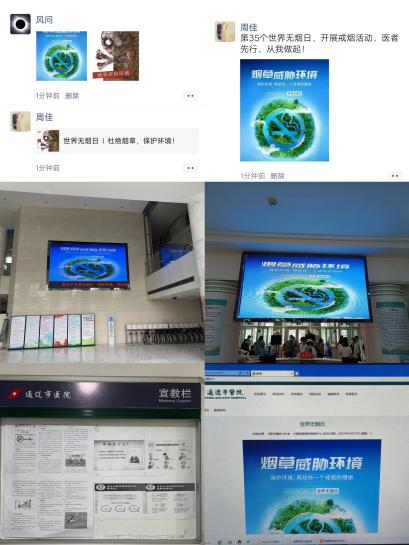 活动主要通过发放宣传折页、微信朋友圈、官方网站、电子显示屏、健康教育宣传栏、吸烟行为劝导等多种形式,向职工、患者及家属宣传烟草危害和控烟戒烟的重要意义,劝诫吸烟人员远离烟草带来的危害,主动参与到戒烟控烟的活动中来,共同守护健康、爱护环境。