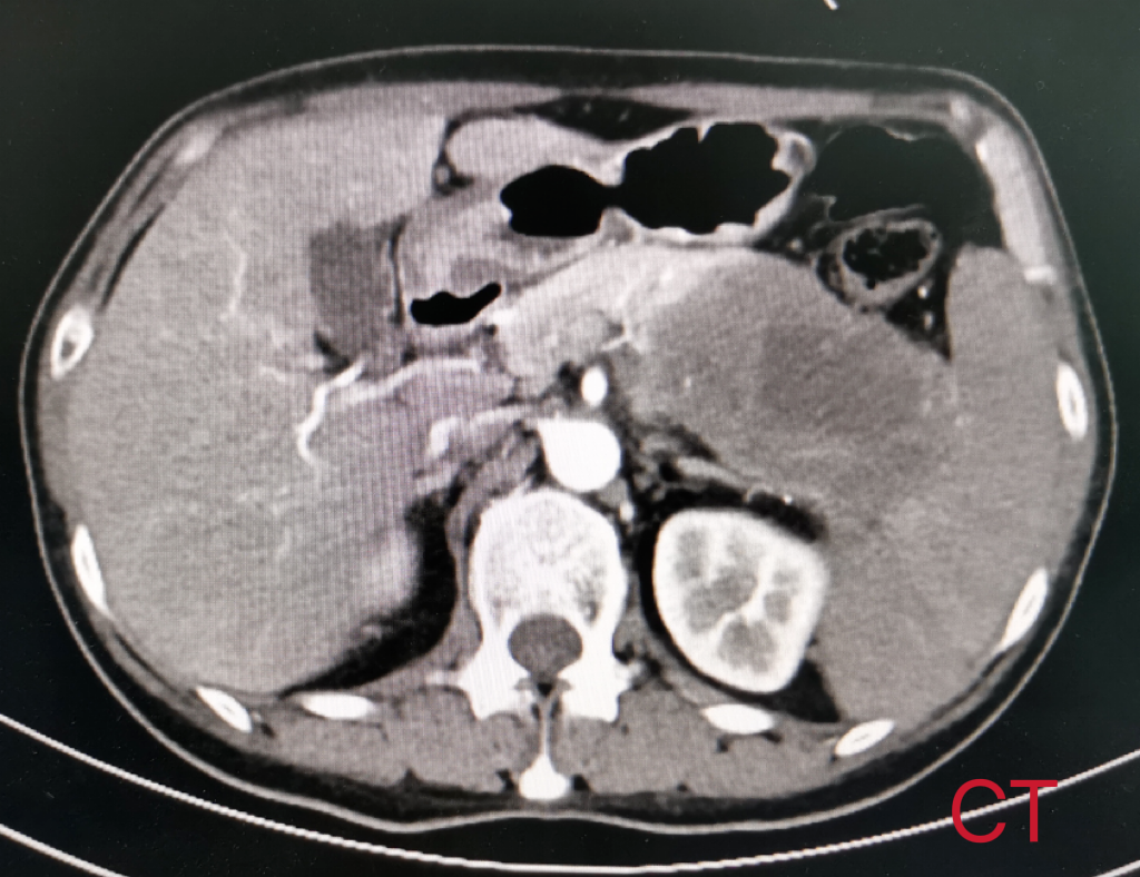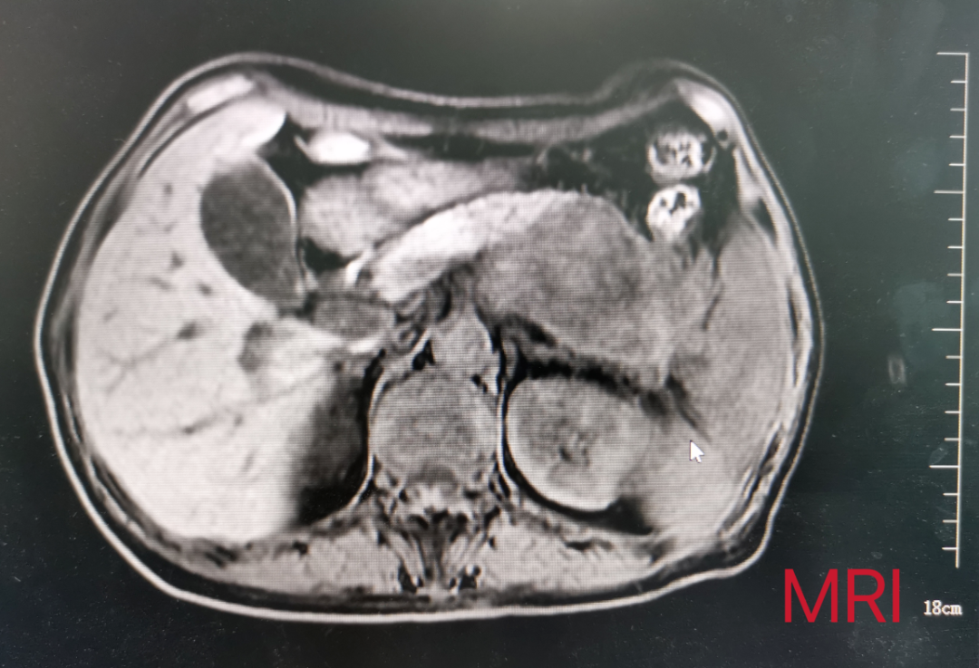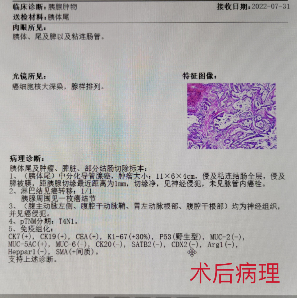 患者女性,57岁,因“间断左上腹疼痛3月余”入院,既往无特殊疾病史。入院后完善相关检查提示:胰腺尾部占位性病变,约8cm×5cm,考虑囊腺癌,累及脾动静脉和腹腔干可能性大。肠镜发现结肠距肛门30cm可见一肿物。患者腹痛逐渐加重,通过术前充分评估和讨论,祁向军主任认为结肠肿物为胰腺肿瘤侵犯所致,在与患者及患者家属充分沟通后,决定立即为患者施行手术治疗。考虑血管侵犯可能以及肿瘤较大,决定为其行胰体尾+脾根治性扩大切除术,包括胰体尾、脾、部分受侵结肠的切除以及周围腹腔淋巴结的清扫,并且备术中腹腔干的切断以及置换。手术成功完成,患者胰体尾、脾、和部分结肠完整切除,现患者已康复出院。