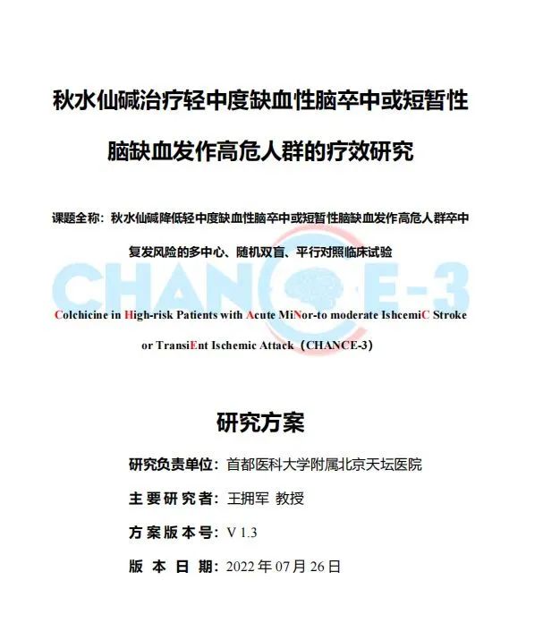 缺血性脑血管事件中约65%为非致残缺血性脑血管事件,即轻型卒中和短暂性脑缺血发作(TIA),仍然有大量卒中复发的残余风险。炎症与动脉粥样硬化斑块的进展和不稳定密切相关,影响卒中复发。国家神经系统疾病临床医学研究中心依托首都医科大学附属北京天坛医院,成立国内规模最大的神经系统疾病领域临床医学研究平台。本研究为一项多中心、随机双盲、平行对照临床研究。在发病 24 小时内 hsCRP≥2mg/L 的轻中度缺血性脑卒中或短暂性脑缺血发作(TIA)高危人群患者中,评价秋水仙碱较安慰剂是否能够降低 90 天内卒中复发风险,尽早使用秋水仙碱进行抗炎治疗的有效性和安全性,为卒中的二级预防提供进一步的诊疗依据。