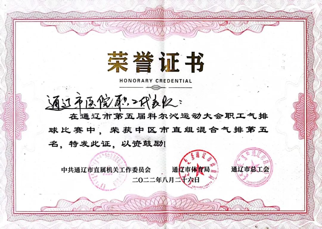 8月22日,由通辽市人民政府主办,通辽市直属机关工作委员会、通辽市体育局、通辽市总工会承办的通辽市第五届科尔沁运动大会“气排球”比赛在通辽市公安局交通管理支队职工活动中心开幕。比赛共有来自各旗县市区、市直机关的27支代表队的270多名职工在为期5天的赛程中开展男子气排、女子气排、混合气排球三个项目的角逐。我院职工代表队积极参赛,并荣获中区市直混合气排第五名的好成绩。