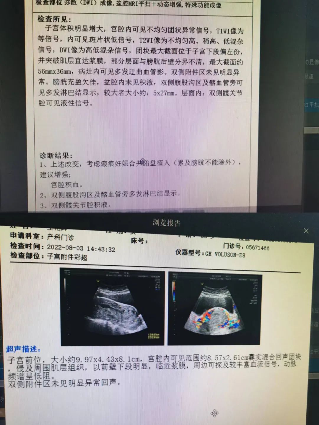 患者女性,38岁,因“停经58天,发现宫腔内囊实混合回声团块1天”入院,既往2次剖宫产史。入院后完善相关检查,人绒毛膜促性腺激素77150.00mIU/mL,盆腔MRI提示:考虑瘢痕妊娠合并胎盘植入(累及膀胱不能除外),子宫附件彩超提示:宫腔内囊实混合回声团块-不除外瘢痕妊娠,请结合血HCG。通过术前充分评估和全科集体讨论,其大出血及膀胱损伤风险高。在与患者及患者家属充分沟通后,决定先为患者施行局麻下“经皮穿刺插管超选择性子宫动脉造影、子宫动脉栓塞术(甲氨蝶呤子宫动脉内注射后明胶海绵颗粒栓塞)”术,术后复查人绒毛膜促性腺激素明显下降,复查超声提示局部血流信号明显减少。再次术前充分评估和全科集体讨论,决定行腹腔镜下Ⅲ型子宫瘢痕妊娠病灶切除术,手术成功完成,术中出血约30ml,既避免大出血、保留子宫,又修复了子宫下段,得到患者及家属的高度肯定。