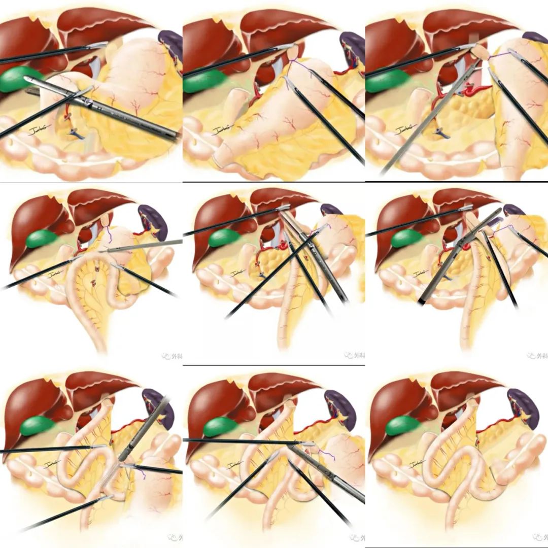 相较于传统的开腹手术,腹腔镜手术具有创伤小、疼痛轻、术后活动早、肠道功能恢复快、住院时间短等优势。近年来,随着腹腔镜下胃癌淋巴结清扫和腔镜下消化道重建技术的日益成熟与规范,微创腹腔镜下胃癌根治术已经成为国内外各大医疗中心最为重要的手术方式,并成为检验一位胃肠外科医师医疗水准的基石。SPLT又名“自牵引,后离断”食管空肠侧侧吻合。“自牵引”把结扎后的食管下段拉入腹腔,后续手术步骤得以在“广阔”的游离腹腔完成。整个吻合过程直观方便,在降低操作难度的同时又能做到高位下段食管的清扫及吻合,安全性大大提高。“后离断”手法先将食管与空肠侧侧吻合,再将远端食管与近端空肠连同共同开口一并切除。这在完全避免传统线性吻合潜在共同开口关闭风险的同时,还能节省多达2枚钉仓,为患者节省手术费用。降低了食管-空肠腔内吻合的技术难度、避免食管回缩,有利于高位清扫及吻合、简化共同开口关闭等诸多优点。