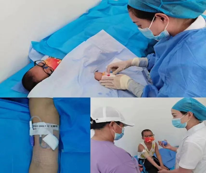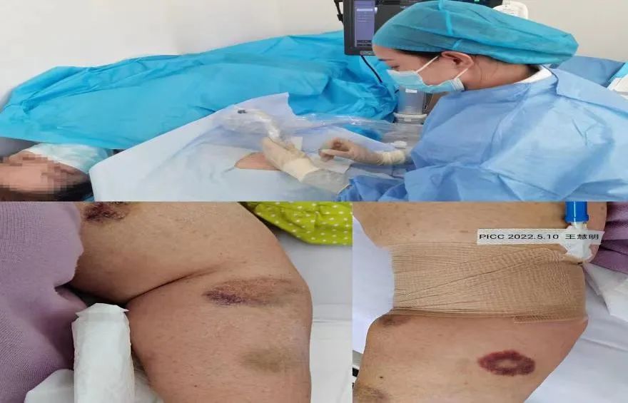 图片患者王某某,55岁,诊断为骨髓增生异常综合症,体态肥胖,外周静脉穿刺困难,超声引导下选择右侧肘上贵要静脉行PICC置管术,过程顺利,与患者家属详细交代携带导管期间注意事项和功能锻炼。