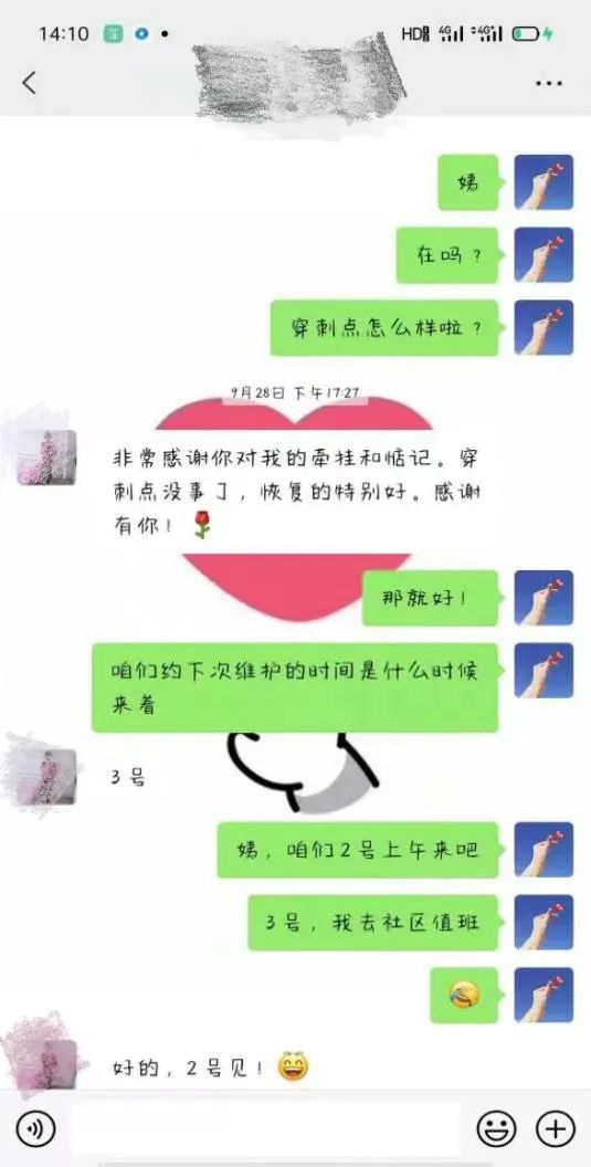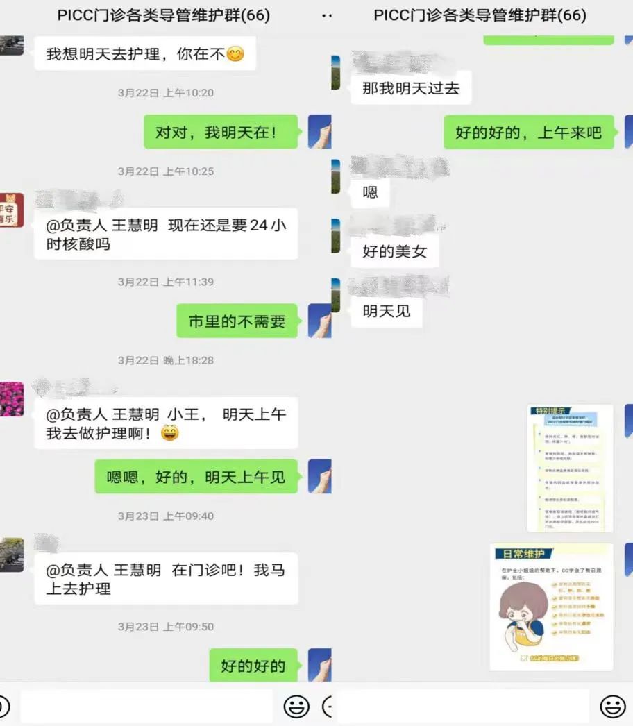 通辽市医院PICC护理门诊秉承着“以患者为中心,全心全意服务于患者”的服务宗旨,根据患者维护周期的需要,建立了PICC患者微信群,为患者和护士的交流搭建了一个便捷、直观的平台,让患者24小时有人管有人问,真正做到让患者无后顾之忧。将出现的一些状况通过文字、图片、视频的形式发送到群里,作出专业的指导和建议,对于特殊问题及时告知患者来院处理,更好的为患者提供精细化诊疗及全程化管理服务。