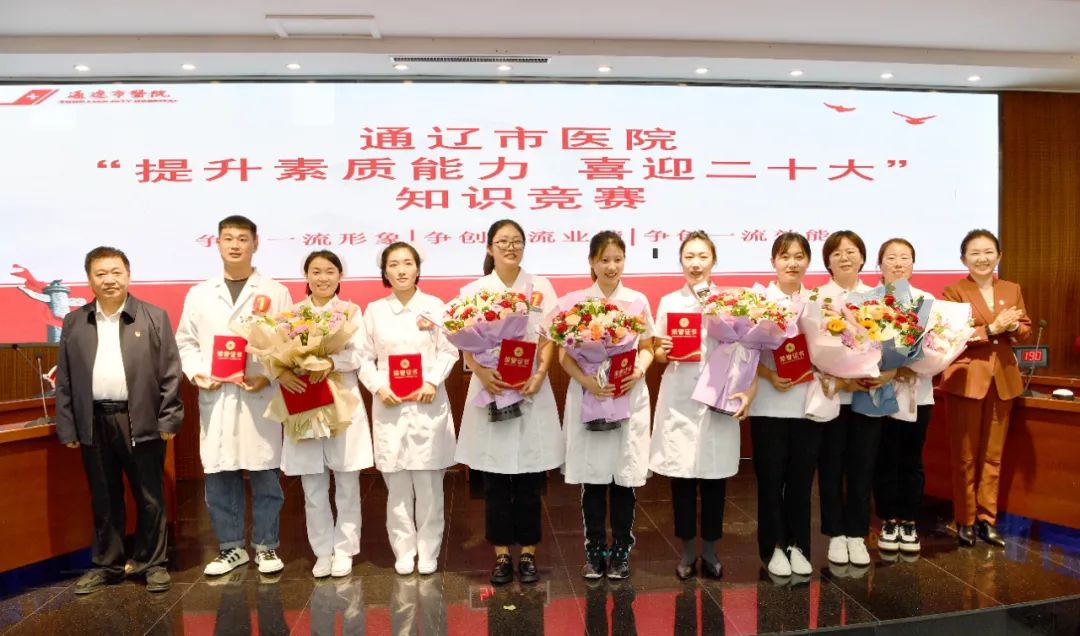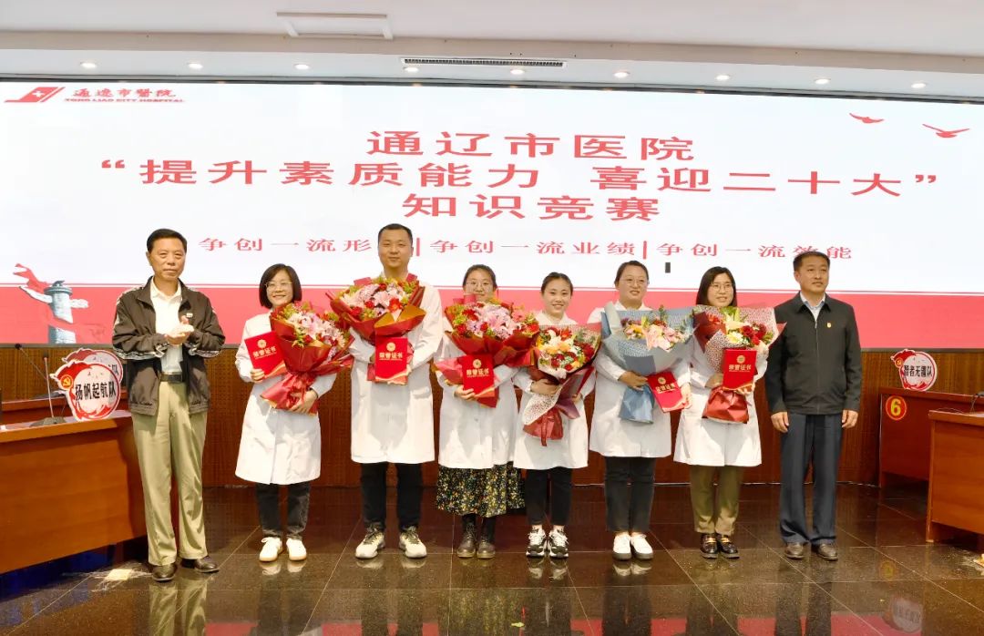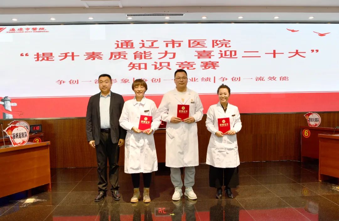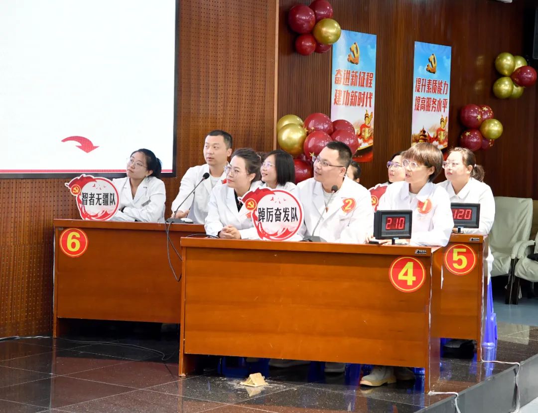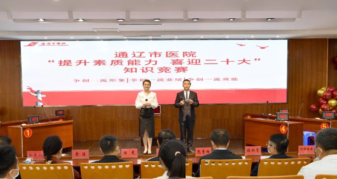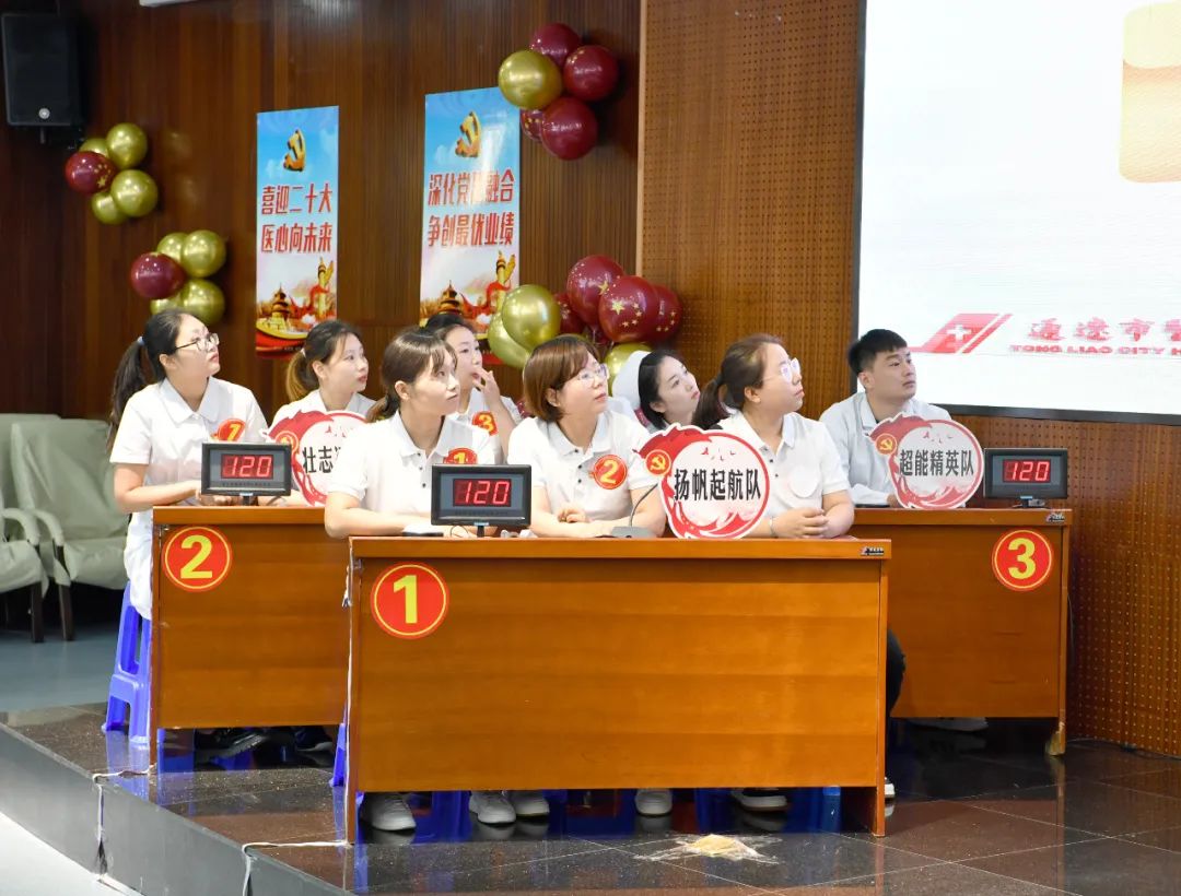 为迎接党的二十大胜利召开,进一步深化党员干部职工素质教育,强化为民情怀、坚定理想信念,不断提高医疗服务质量和服务效能,推进医院党建与业务工作深度融合,9月23日下午,在院党委的统一部署下,我院在干部病房一楼会议室组织举办“提升素质能力 喜迎二十大”知识竞赛决赛。市直属机关纪检监察工委书记白光,通辽市卫健委党组成员、副主任郑国庆,市纪委驻卫健委纪检监察组副组长包青柏及院班子成员出席竞赛。我院共有十一个党支部进行预赛,最终有6个支部进入本次决赛。