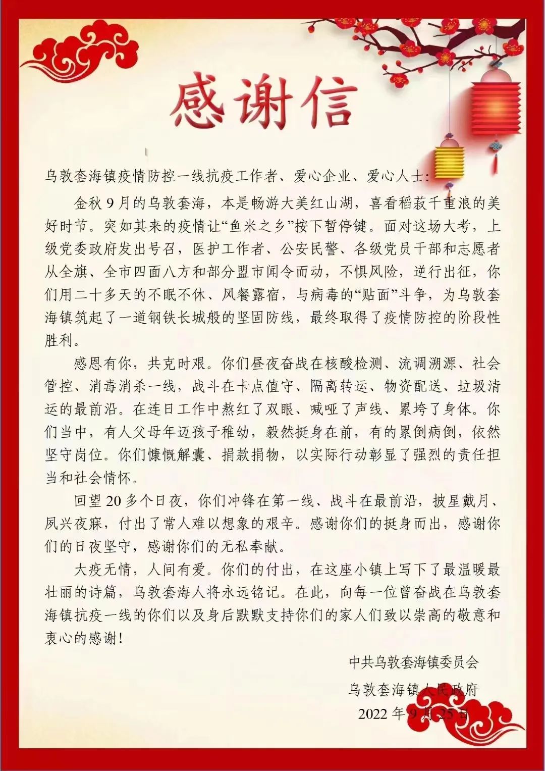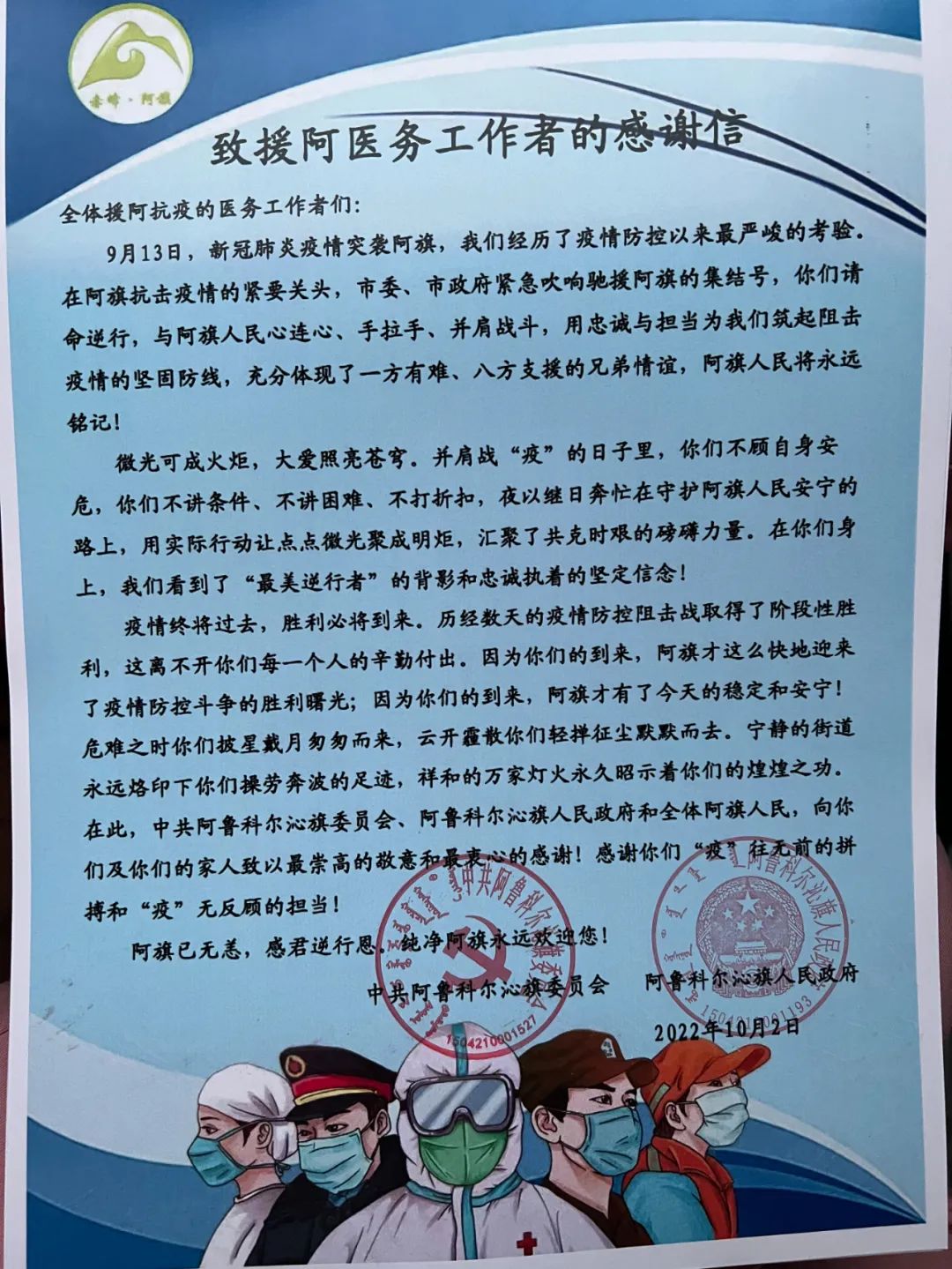 此次支援任务时间紧、任务重、要求高,到达赤峰后,我院医疗队员迅速投入战斗状态,在最短时间、最高效率先后在新苏莫、乌敦套海、天山阿旗方舱实验室出色完成任务。共计完成70851管、563456人次检测任务,获得当地政府的高度认可,并收到感谢信、奖牌和荣誉证书。我院领队白子军表示,“能够圆满完成此次任务,得益于队员们上下一心,相互配合,摸索出了如‘流水线’一般的最高效的工作流程。”