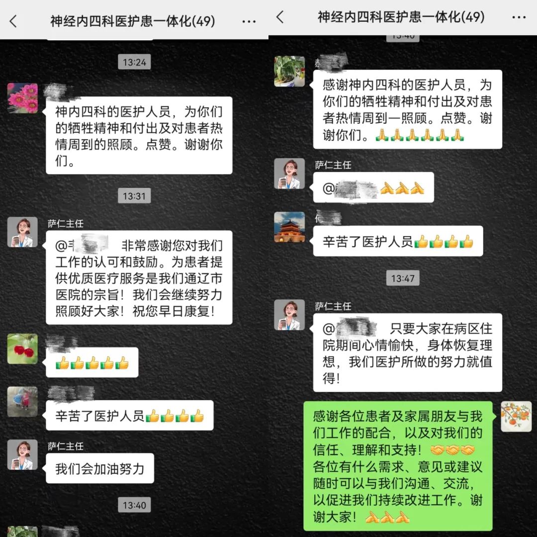 为了最大限度地为患者提供优质护理服务、加强健康宣教的效果、促进患者早日康复、提高患者满意度、有效促进医护患家属四方的同步沟通,神经内四科建立了医护患家属一体化微信群,为患者及家属提供疫情相关最权威官方信息、健康宣教、心理咨询,通过发送照片、视频、音乐等内容为患者及家属解压、舒缓情绪,征求大家意见和建议,及时满足患者诉求,受到一致好评。