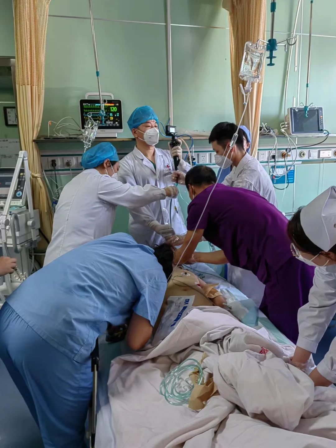 面对疫情,呼吸与危重症医学科全体医护人员积极响应医院号召,全力做好科室的治疗护理及消杀工作,科室患者普遍病情风险高,病情变化快。11月15日,在工作量激增的基础上,一名58岁肺炎患者突发病情加重后立即转至RICU,血氧饱和度降至18% ,在给予吸痰过程中又突发癫痫发作,病情进一步恶化,科室主任韩向中迅速组织人员抢救,在医护的共同努力下,患者抢救成功,转危为安。关键时刻,科室人员沉着冷静,力挽狂澜,再一次证明了我院呼吸与危重症医学科的“硬核”实力。