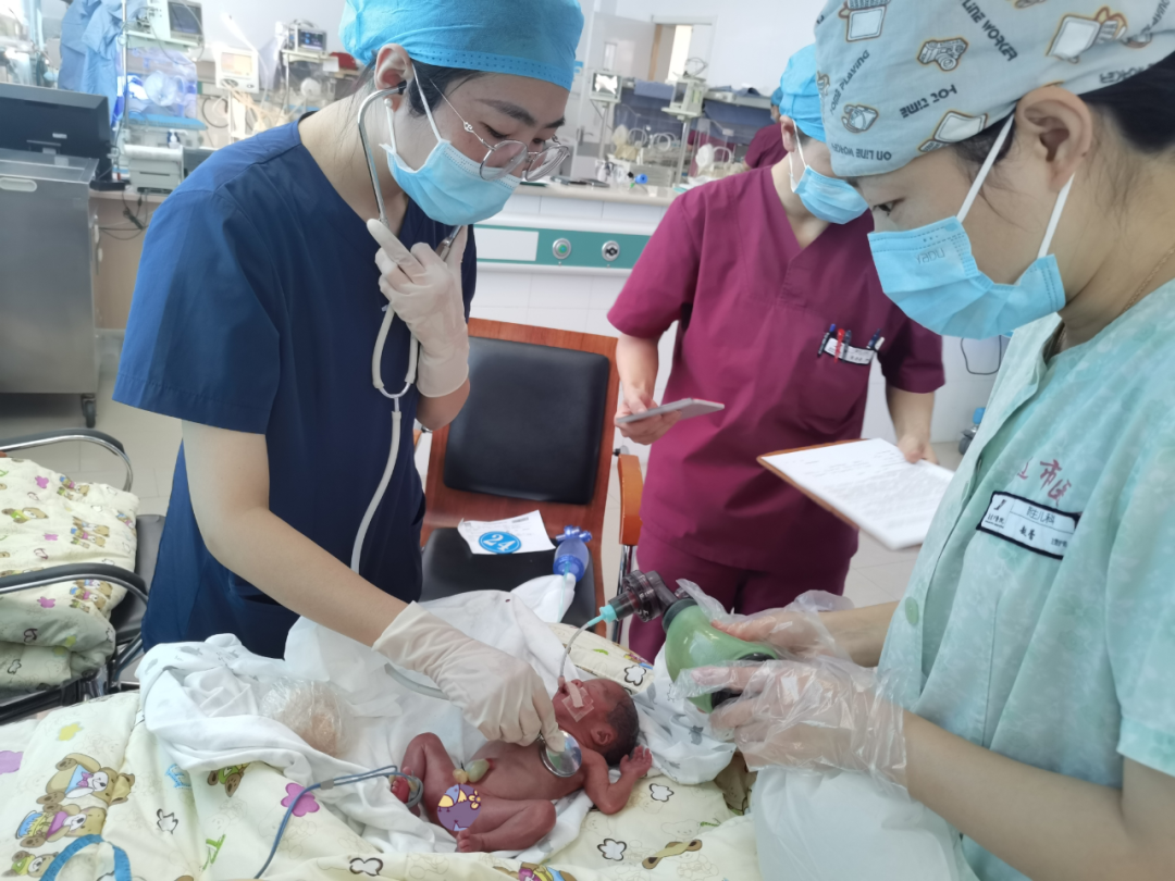 10月11日,凌晨三点的新生儿重症监护室依旧灯火通明,监护仪及呼吸机工作的嘀嗒声和偶尔出现的患儿哭声,在寂静的夜空中显得格外清晰。突然,一阵急促的铃声响起,“我们是产科,有一对胎龄28周的双胞胎早产儿,需要紧急抢救,请新生儿科医护做好急救准备,配合抢救。”挂掉电话,值班医生张扬和护士魏巍拿起抢救箱赶往产科,娩出后没有自主呼吸的28周双胞胎早产宝宝,全身青紫,情况十分危急,产科及新生儿科医护人员立即给予宝宝心肺复苏抢救,在所有人的共同努力下,宝宝逐渐恢复呼吸,随即转入新生儿重症监护室,给予气管插管,呼吸机辅助通气。