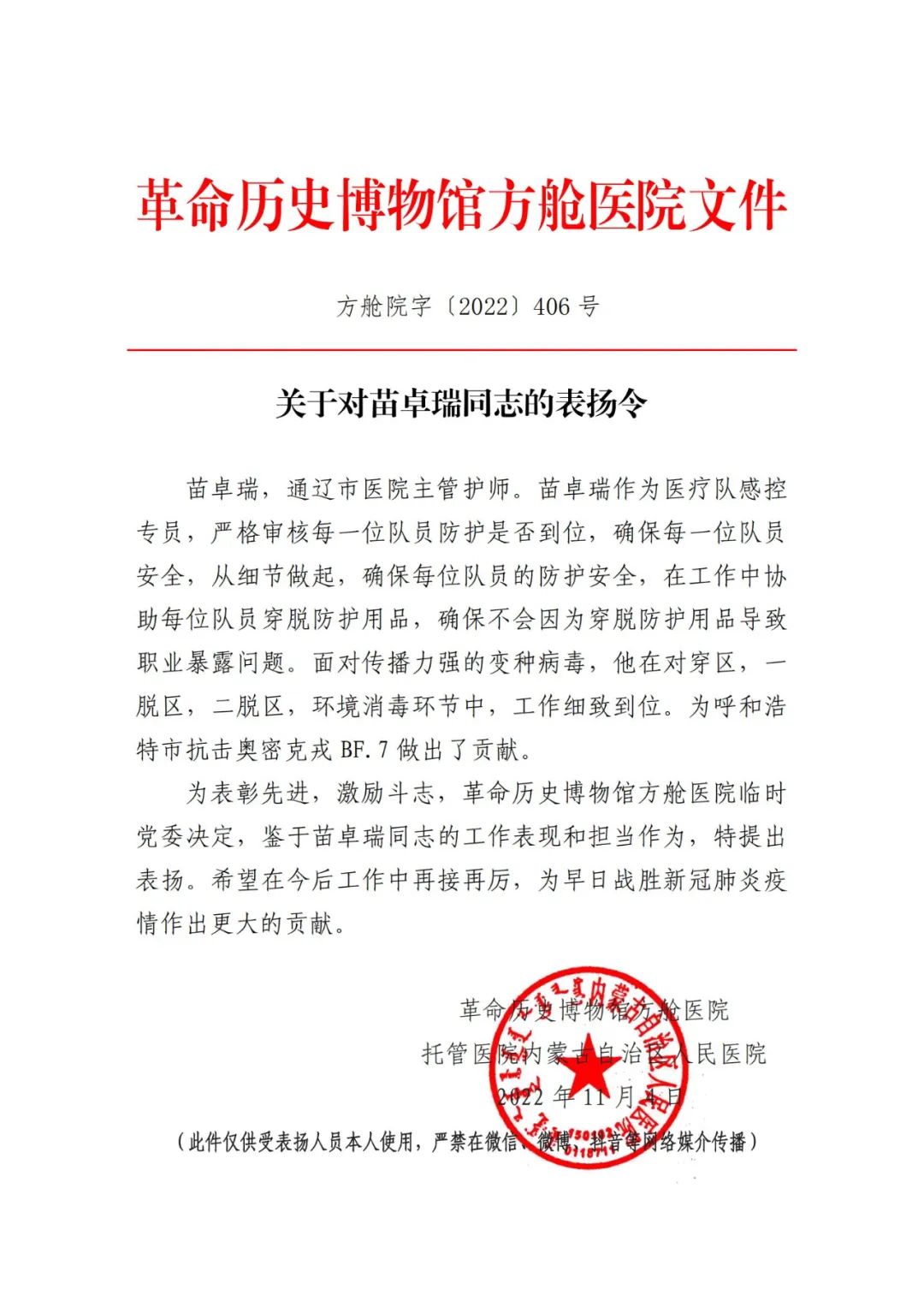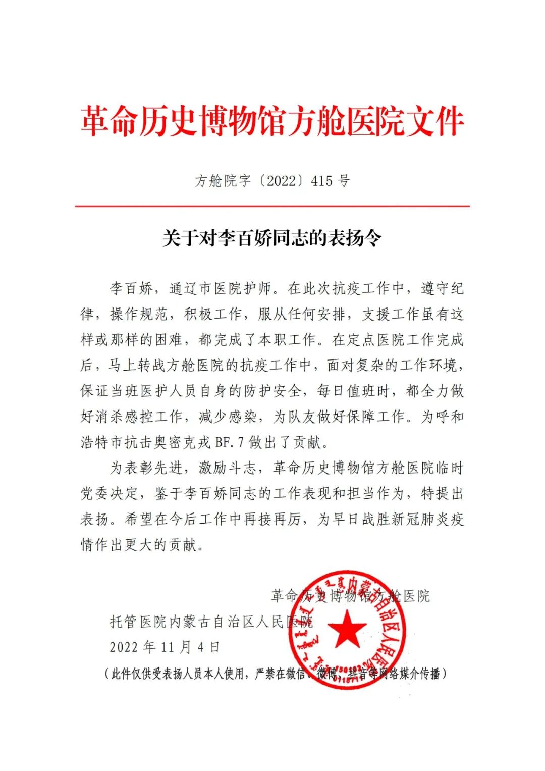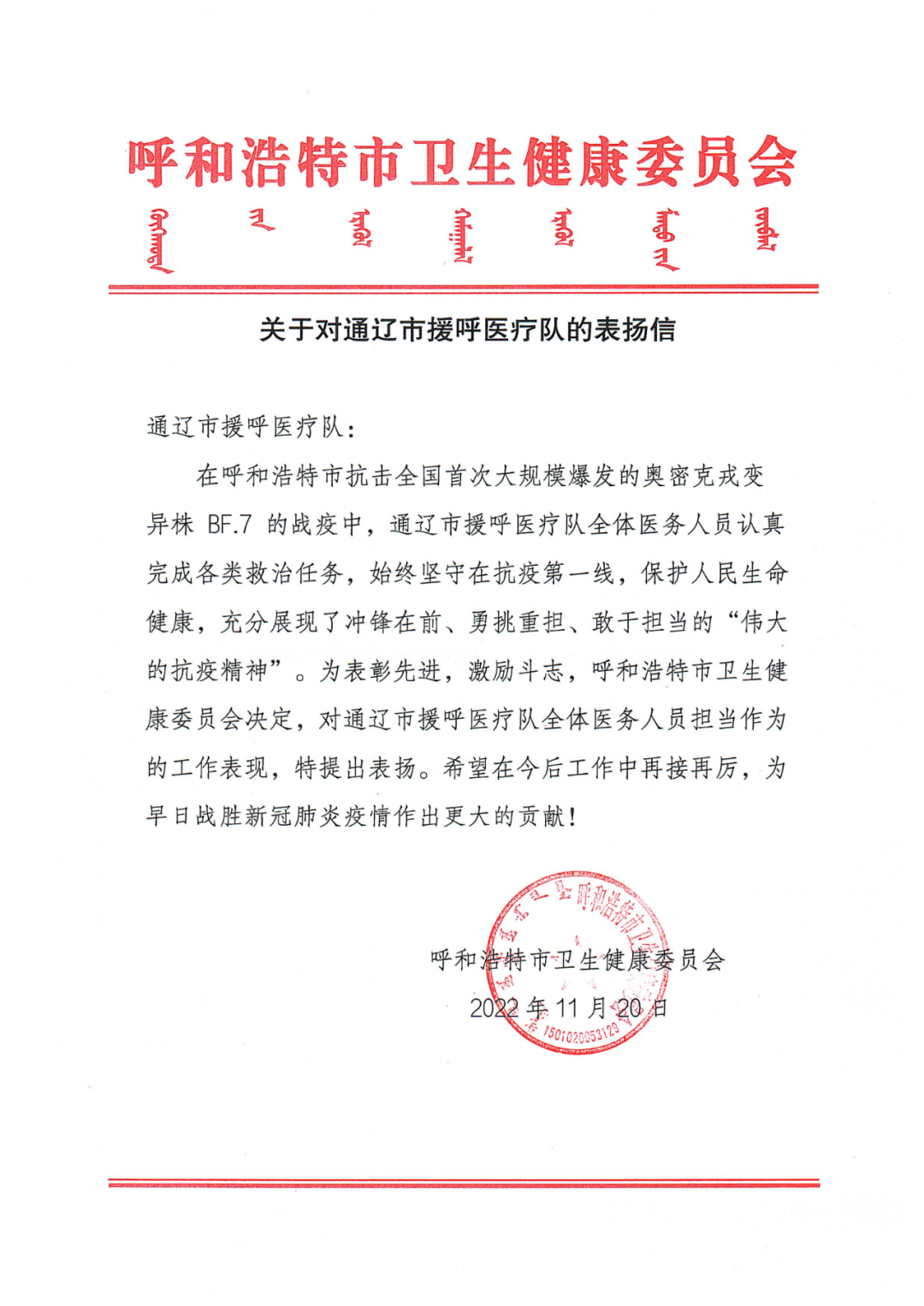 近日,我院驰援呼和浩特市的医护人员李百娇、苗卓瑞以及由我院崔耀元带队的通辽援呼医疗队因工作表现突出、担当作为,充分发挥医务人员先锋模范作用而获表扬。