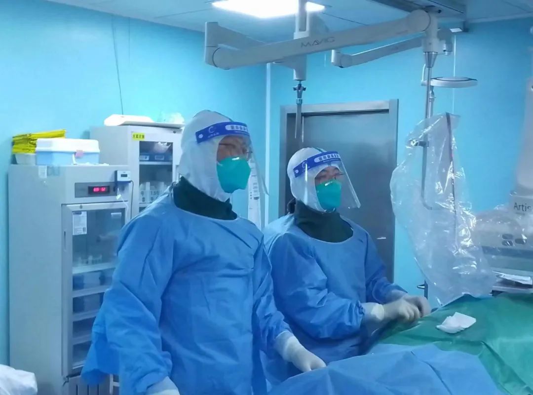 23:59分,市传染病医院紧急联系我院副院长、第一方舱医院院长杜建军请求支援。经诊断,该患者为急性非ST段抬高性心肌梗死,Grace评分极高危组,立即指导药物治疗,同时建议紧急行冠脉造影,必要时行介入治疗。时间就是生命,刻不容缓,在市卫健委的统筹下,考虑到该患者为新冠病人,经研判后,将患者迅速转运至相对封闭的市二院导管室进行抢救,由我院方舱医院闭环管理的心内科专家郑凯、梁羽以及护士李洪波组成介入团队开展手术抢救。
