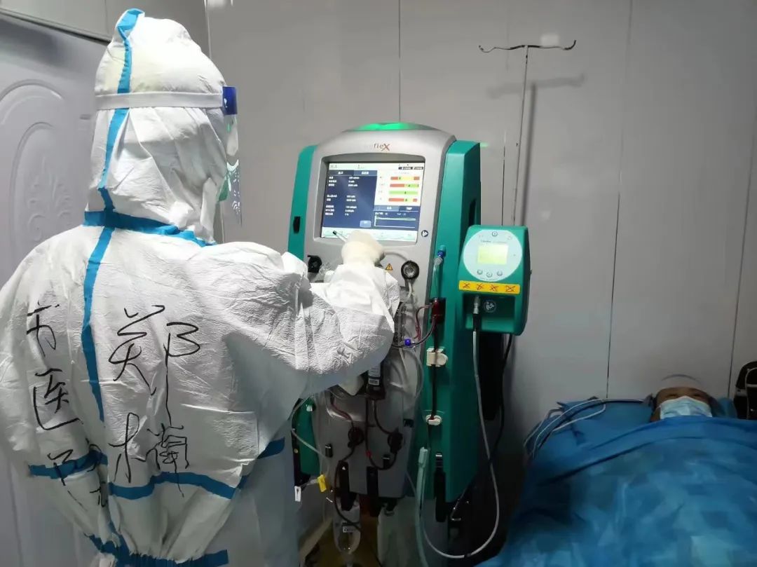 经过一天一夜奋战,我们在感控专家指导下、在当地医院领导及工作人员的通力协作下,终于在14日下午5点成功完成改造,经过专家组研判,符合临时收治要求,可作为临时接收过渡使用。立即将两名患者转移至此,经化验,患者的血钾已高至6.1mmol/L,我们第一时间开展床旁血液净化治疗,经过一夜的努力,到第二日8点,两位患者的体温及血钾均已降至正常。