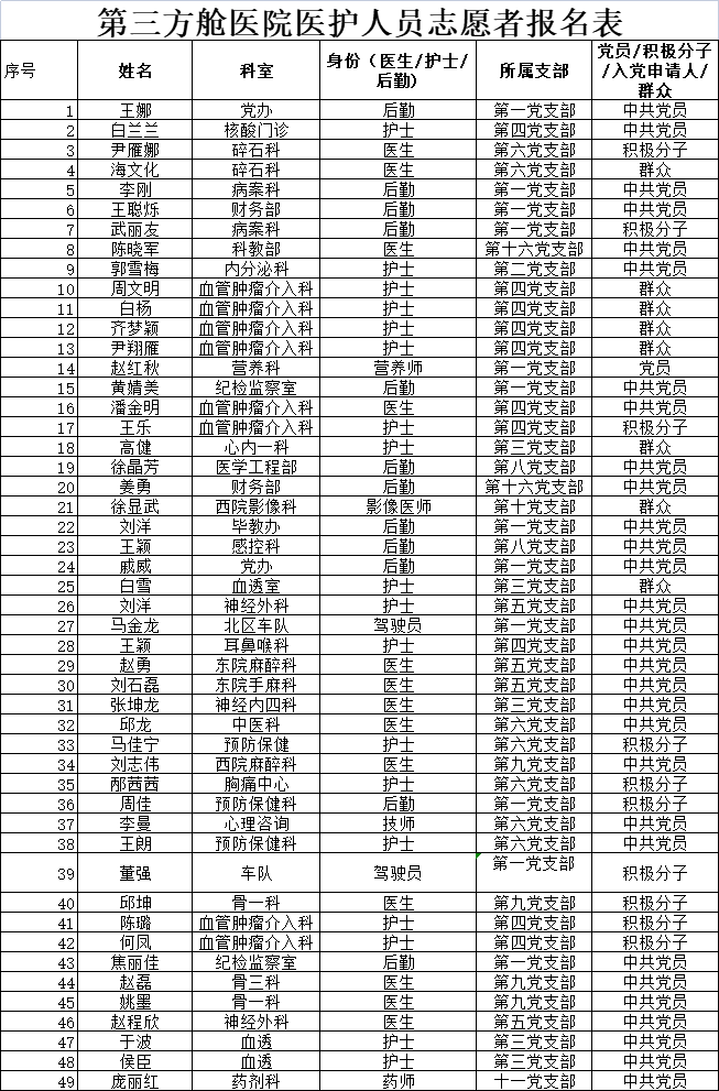 在医院人员严重紧缺的情况下,截至目前,第三方舱医院医护志愿者报名人数已达49人。医生16人,护士18人,后勤人员15人,其中党员31人,积极分子10人,群众8人。各位志愿者尤其是党员志愿者们充分发挥了先锋模范作用,其中很多党员医护人员已经在一线连续奋战多天,他们舍小家为大家,吃苦在先,冲锋在前,随时待命,形成了“党员带头引领,群众主动参与”的良好氛围,为通辽市的疫情防控工作积极贡献力量。