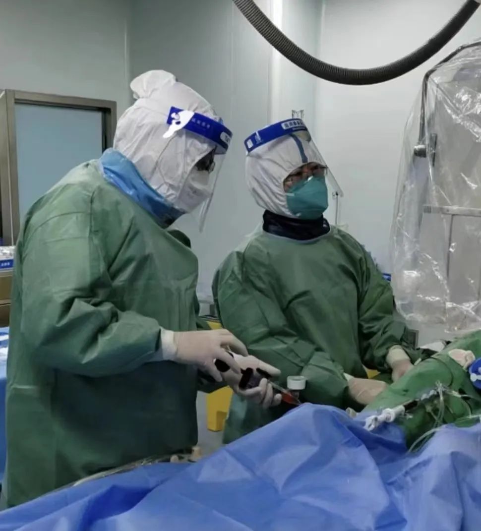 这本是一台常规的介入手术,但由于采取了“二级防护”,医生穿着密不透风的防护服,再加上厚重的铅衣,使每一步操作都比较艰难。面屏模糊了视线,双层手套下的操作手感消失了,关键是很快洗手衣就被汗水湿透。尽管如此,专家们还是凭借着过硬的技术水平,稳步推进着手术步骤。