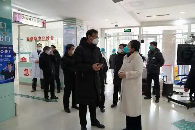 曹金山一行现场查看了我院门诊工作,详细听取了我院当前疫情形势下的紧急医疗救治工作部署情况,特别是急危重症患者的救治和药品储备等情况,并慰问感谢奋战在一线的医务工作人员。