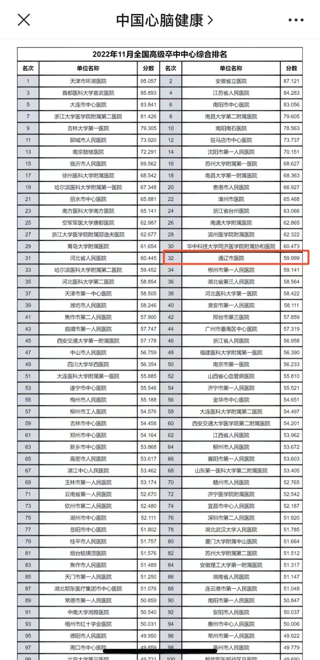 一分耕耘一分收获。近日国家脑防委发布了11月份全国脑卒中中心排名,在566家高级卒中中心中我院脱颖而出,取得第32名的好成绩。我院卒中中心是国家高级卒中中心、国家卒中联盟成员单位、通辽市卒中急救地图管理单位、通辽市脑血管病专科联盟及质控中心及通辽市神经内科质控中心。2019年3月至今,中心已完成静脉溶栓直报838例,AIS(急性缺血性脑卒中)介入再通完成165例,动脉瘤手术210例,CEA手术(颈动脉内膜剥脱术)106例,CAS手术(颈动脉支架置入术)140例,该五大核心技术均处于自治区及全国的领先位置,综合排名跻身全国高级卒中中心前五十,位列自治区榜首。