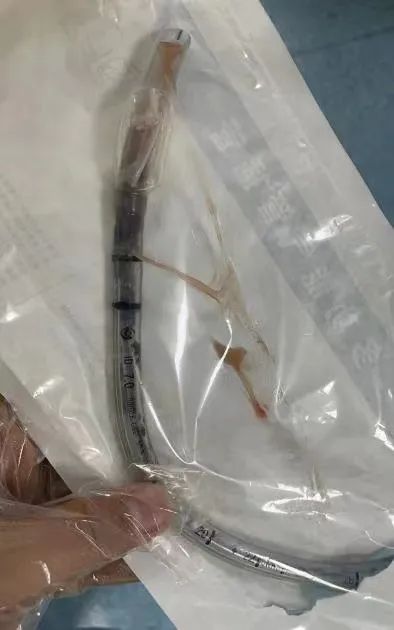 ▲ 气管插管堵塞呼吸机波形及因痰堵塞的气管插管导管