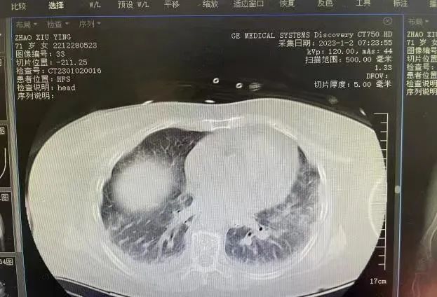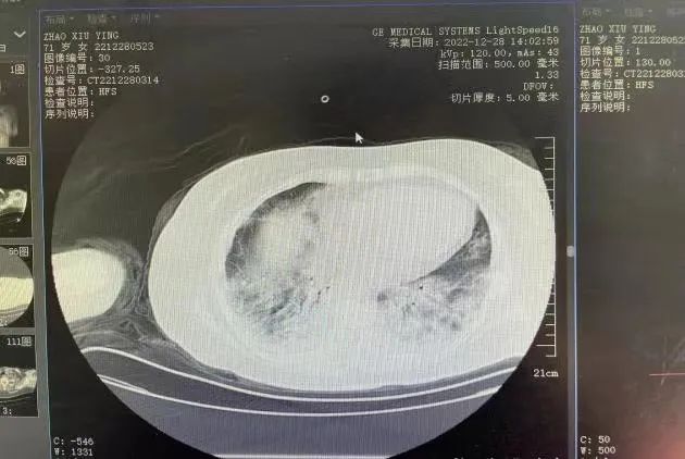 2022年12月28日下午4时许,通辽市医院急诊重症医学科值班医生董鹏接到电话后立即赶到急诊抢救室,急会诊一位因“咳嗽、发热1周,呼吸困难1日”的71岁老年患者,双侧“大白肺”(白肺是肺部影像学表现的一个口语化描述。一般来讲,肺部炎症比较重、渗出比较多,即白色影像区域面积达到70%到80%之时,在临床上被口语化称为白肺)。老人既往体质差,存在高血压、糖尿病等基础病史,考虑存在ARDS(急性呼吸窘迫综合征),病情十分危急,需立即实施抢救,经与家属沟通后立即收入急诊重症医学科治疗。