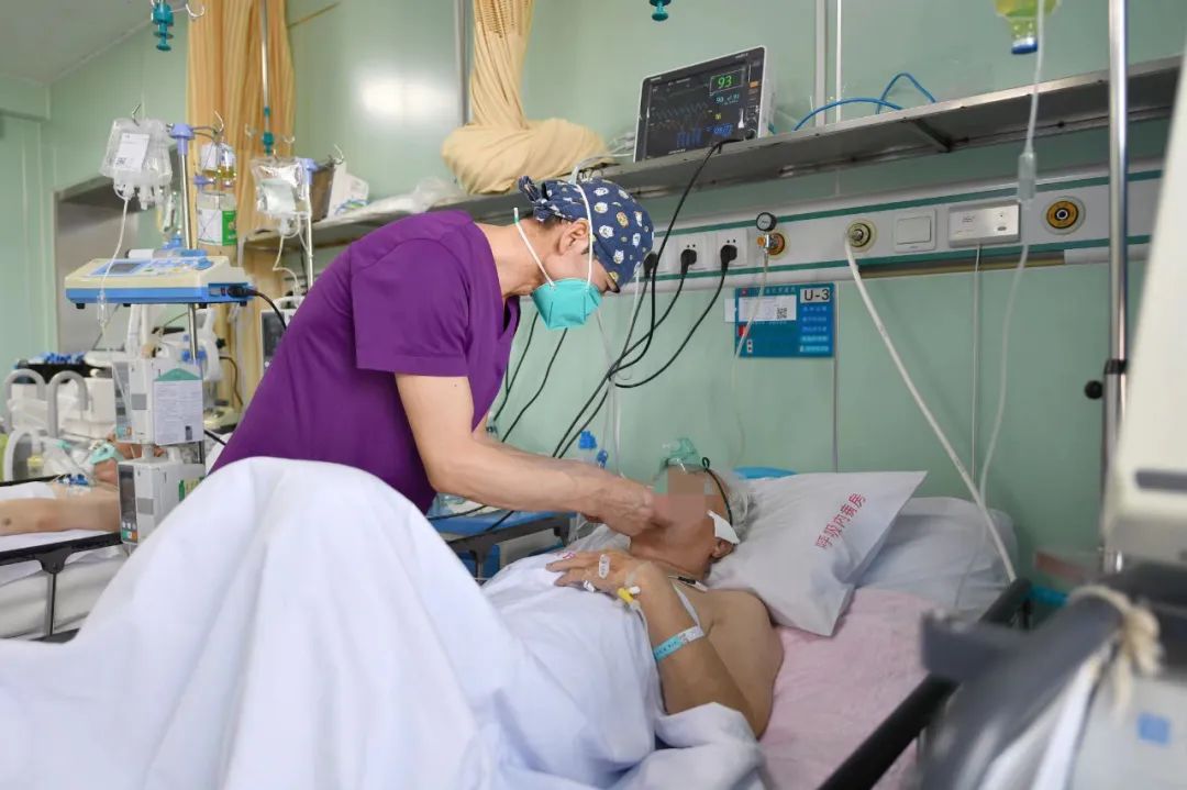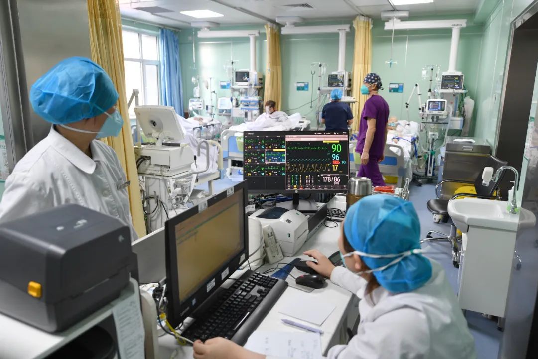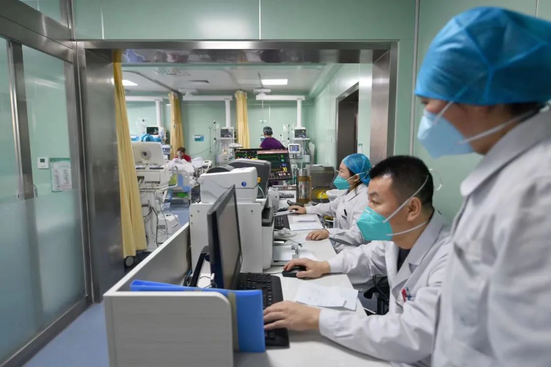 自12月8日起,科室门诊医生最高峰时接诊门诊量超过平时的三倍,两名门诊医生每天从早到晚、加班加点,争取让每一个挂上号的患者都能看上病;病区76张病床几乎每天爆满,特别是RICU内更是每天满床,收治的患者大多数是合并基础病的老年患者,最高龄为90多岁。入院时,血氧饱和度低、呼吸困难,需要有创呼吸机、高流量氧疗仪等硬件设备辅助治疗,且危重症老年患者病情变化迅速,需要随时调整治疗方案,必须24小时持续观察,医护人员的工作量相较平时至少增加3倍。除此之外,医生们还要负责全院每天30-40人次的会诊,每个值班的医生均超负荷工作,特别是在科室医护人员逐渐感染的过程中,患者量也在不断地增加,为了满足患者的救治需求,他们主动放弃了休息,坚守岗位,顶起属于患者的那片天。