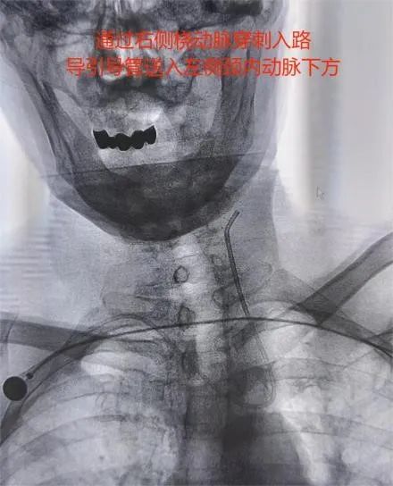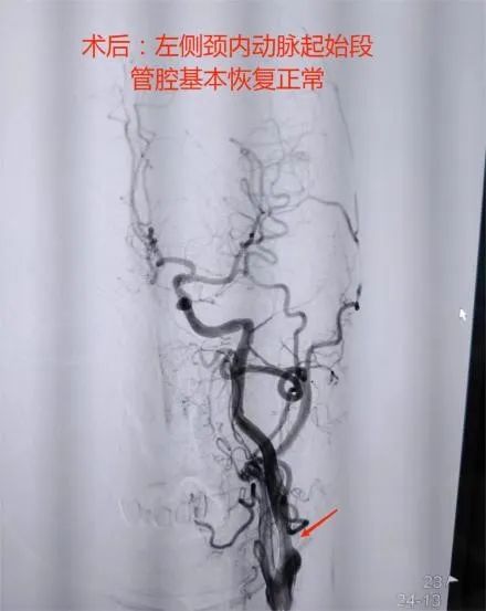患者孙某因“急性脑梗死”来我院神经内三科就诊,完善相关检查发现该患左侧颈内动脉起始段重度狭窄。一旦闭塞将出现半身不遂等严重后果,为给予患者进一步治疗,以“颈动脉狭窄”收入我院神经内科三病区。因患者对常规股动脉穿刺入路存在恐惧心理,对导尿存在不适感,对股动脉穿刺可能产生的皮下血肿及假性动脉瘤等可能发生的并发症难以接受,经神经内三科医护团队的认真分析、研讨:1.患者右侧桡动脉搏动良好,符合穿刺置换的条件;2.Alle实验阴性;3.患者左侧颈总动脉发自头臂干,经桡动脉路径会更好到达责任血管。因此,决定由李士伟医生经右侧桡动脉入路行左侧颈动脉支架植入术。手术用时30分钟顺利完成,患者术后6小时即解除桡动脉压迫,自主 活动良好。