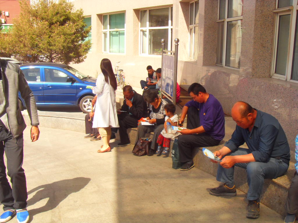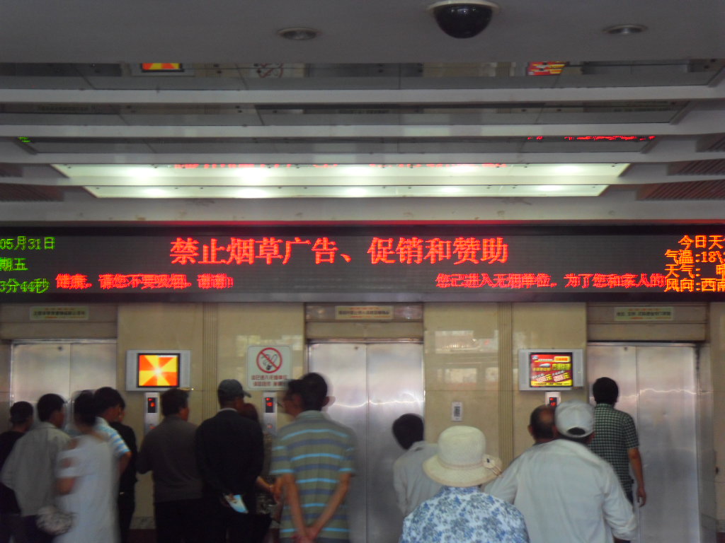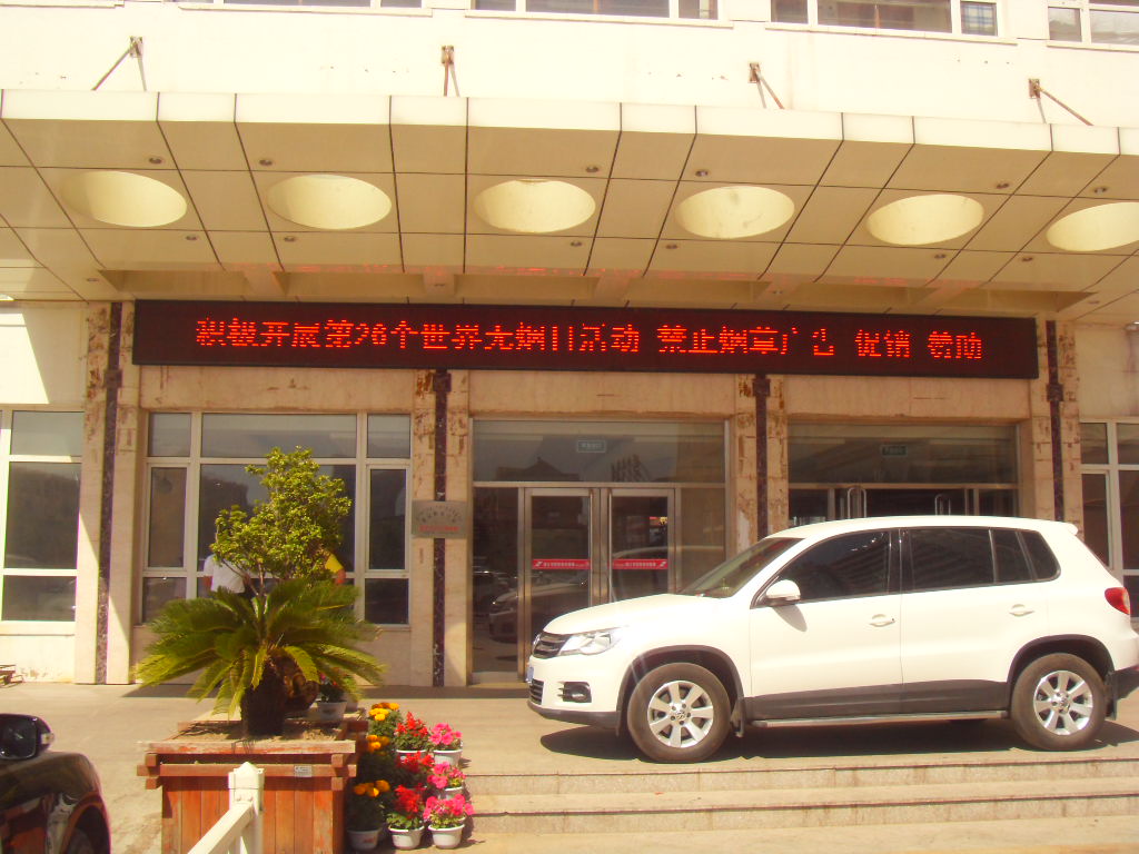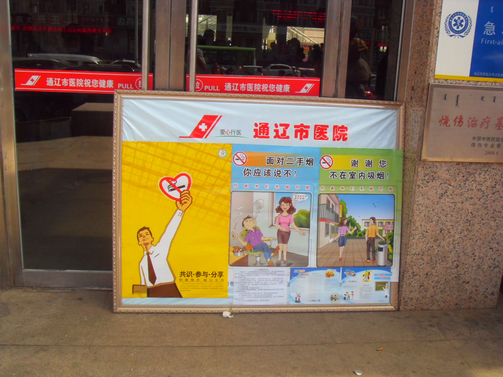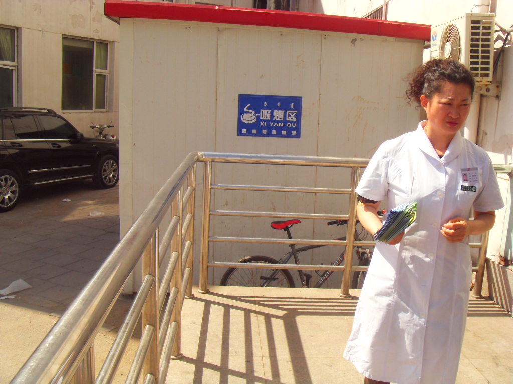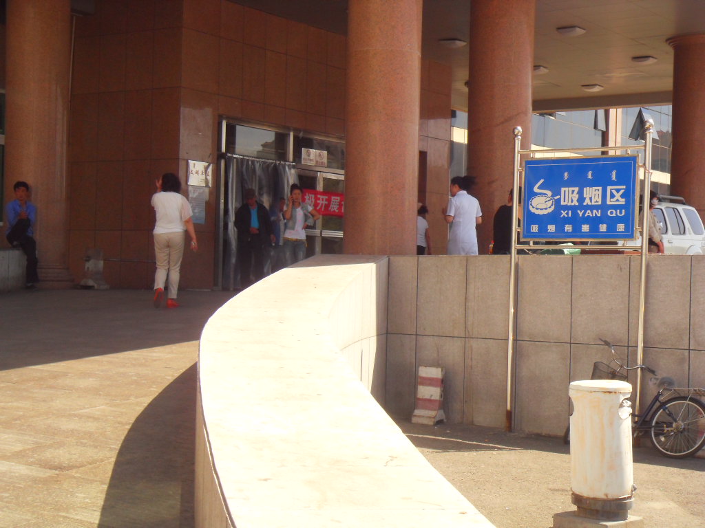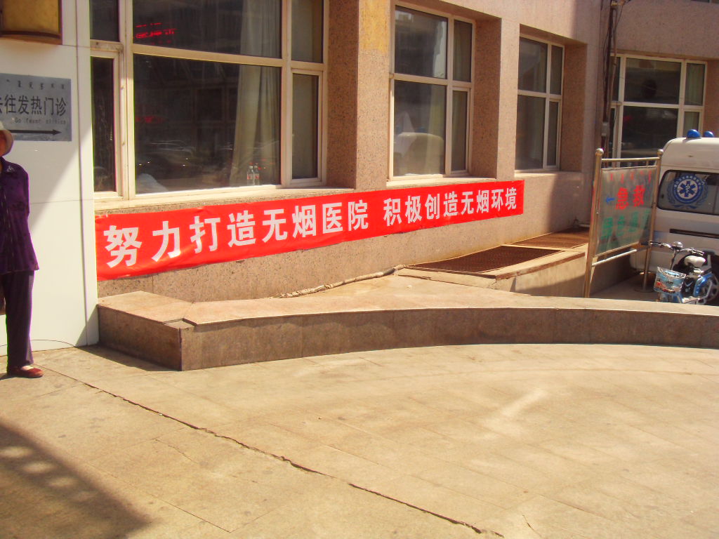 住院大楼门前吸烟区、门口条幅 |