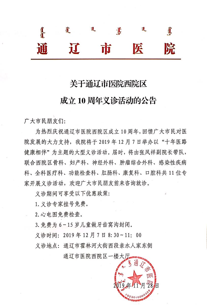 关于通辽市医院西院区成立10周年义诊活动的公告