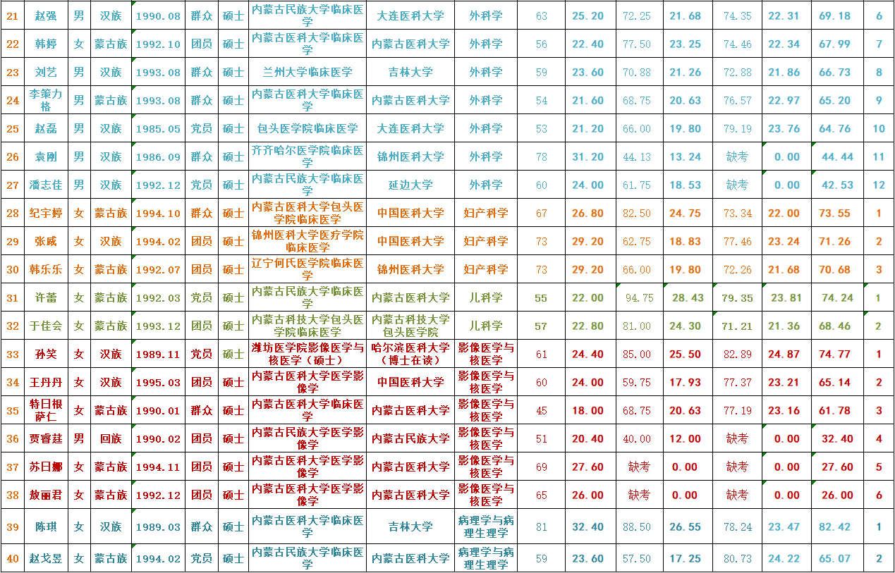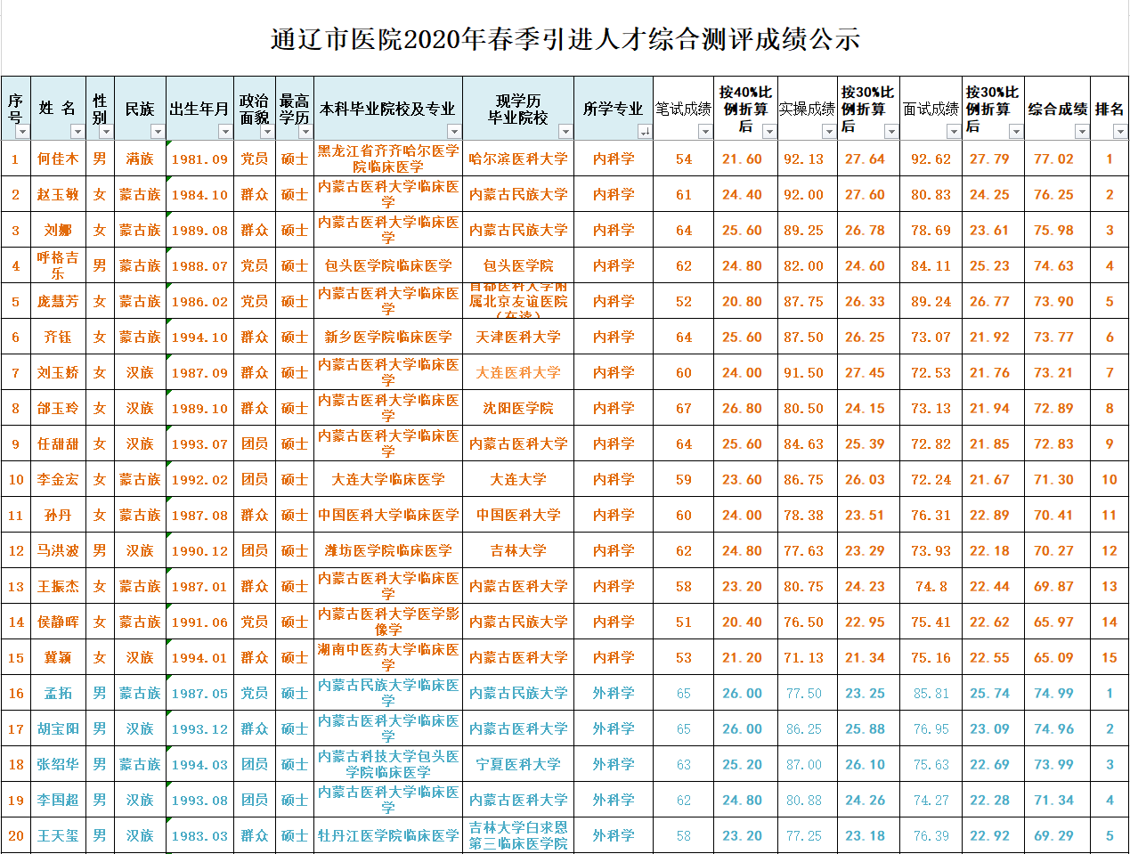 通辽市医院2020年春季引进人才综合测评成绩公示