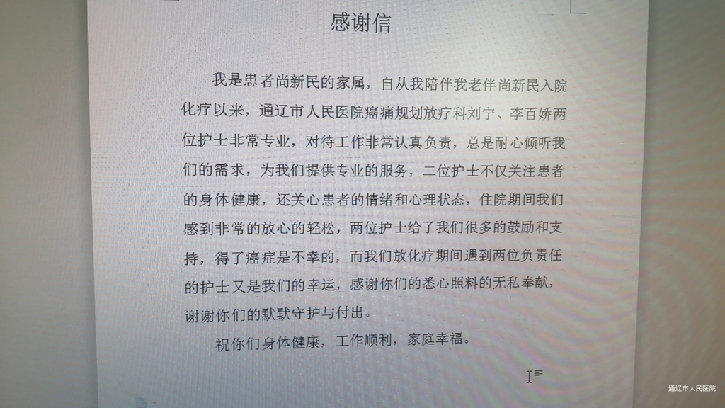患者致:肿瘤放疗科刘宁、李百娇