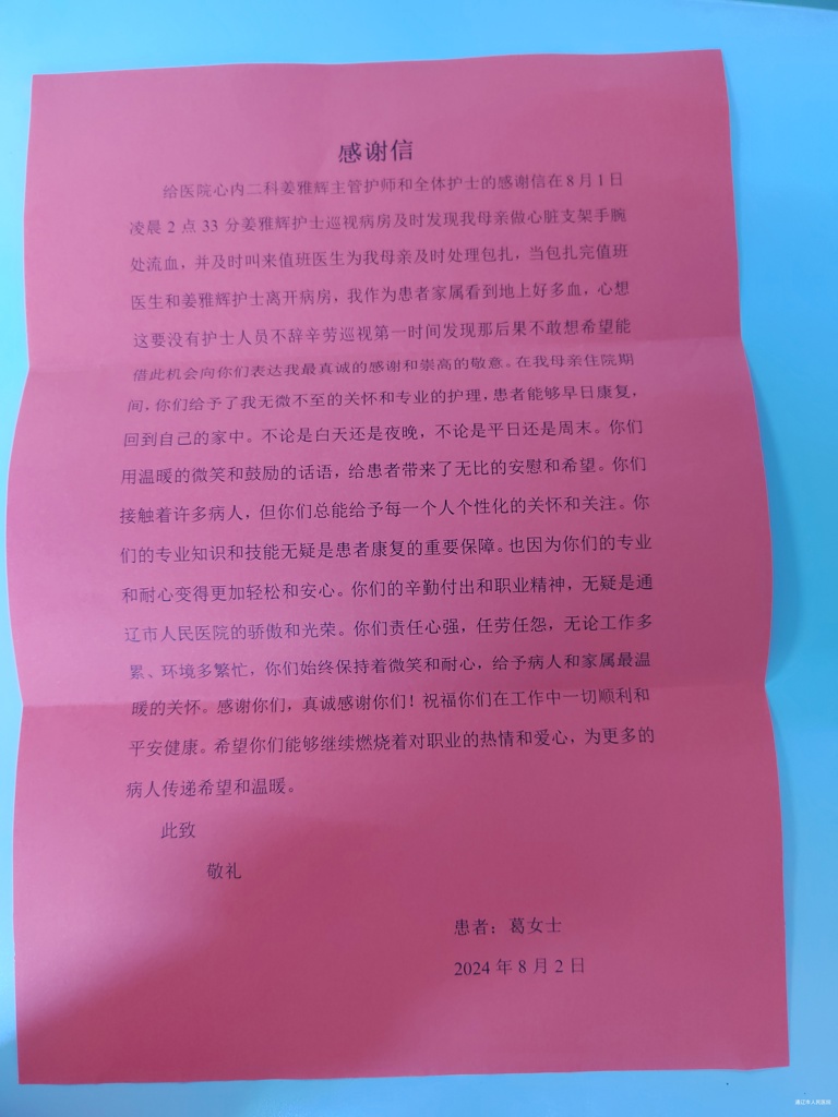 患者致:心内二科姜雅辉全体护士