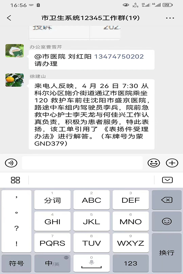 患者致:院前急救中心何佳兴、李天龙、李斌