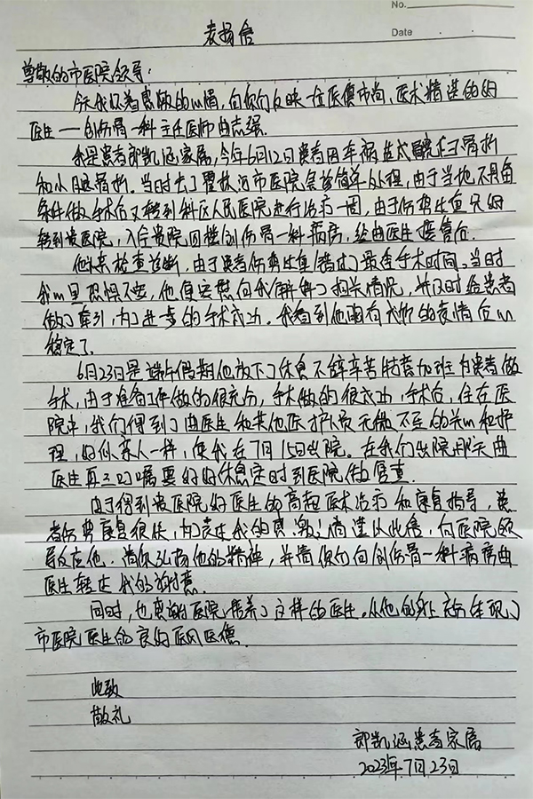 患者致:创伤外科一科曲志强