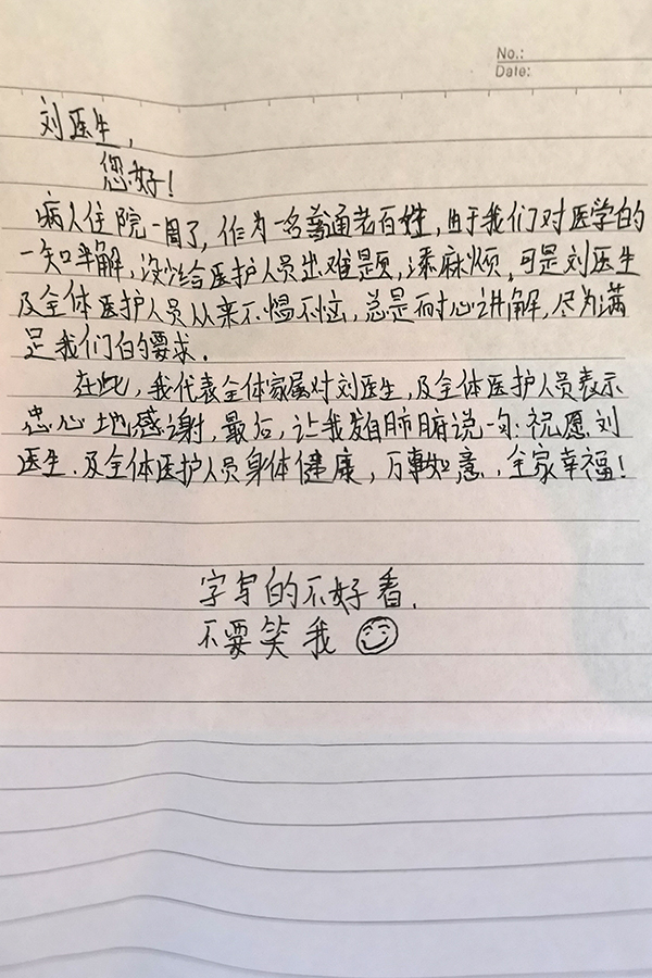 患者致:肿瘤放疗科刘宏宇