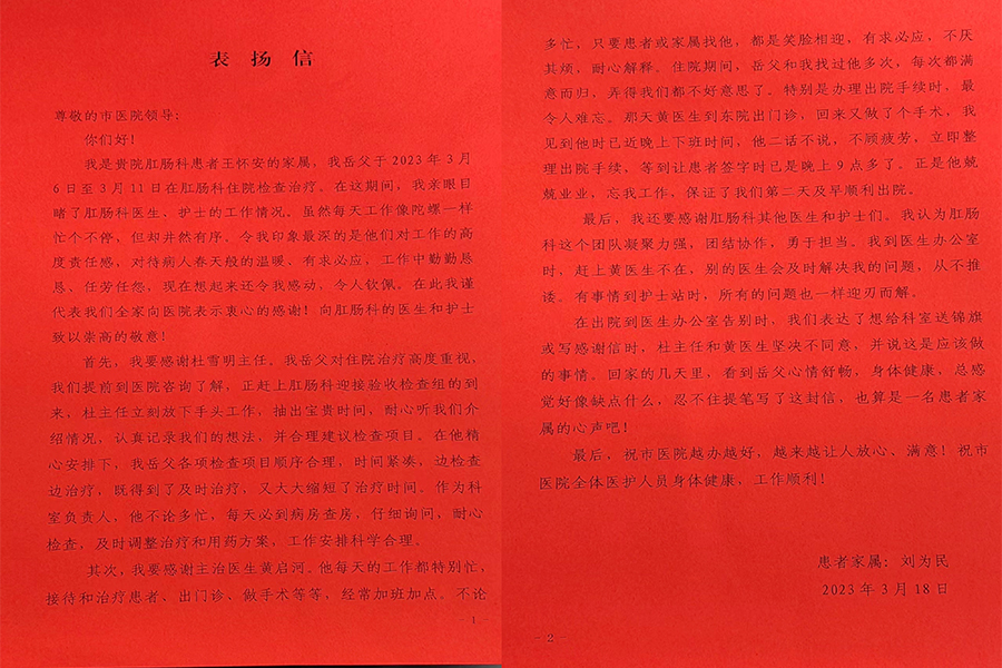 患者致:肛肠科全体医护
