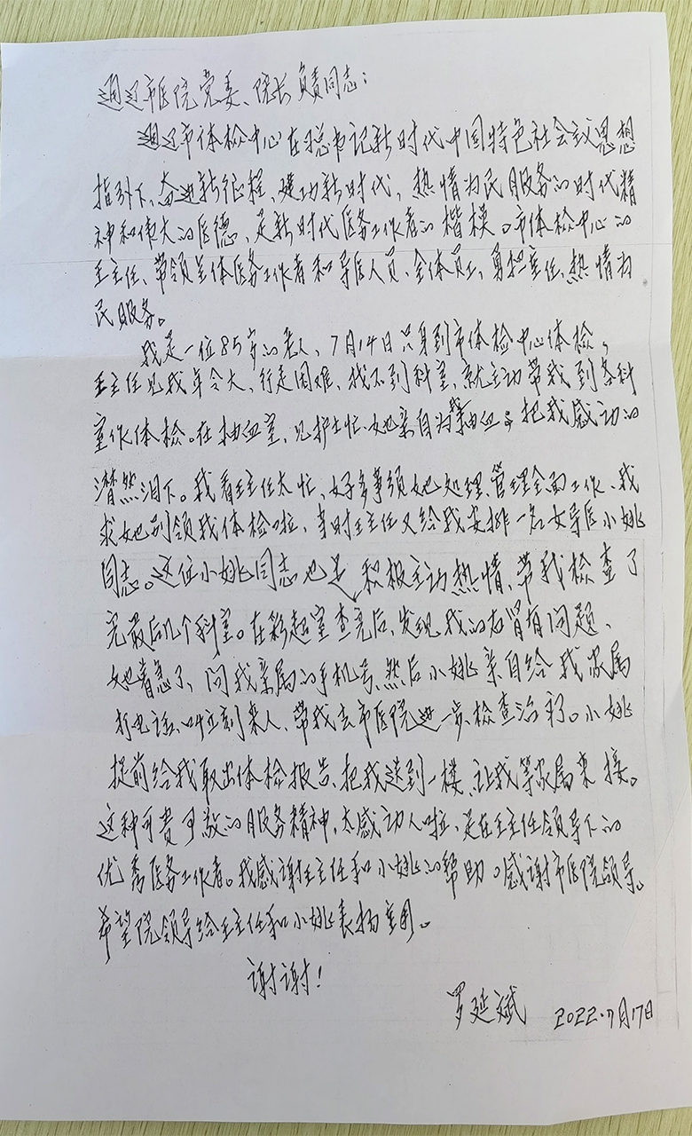 患者致:体检中心王颖、姚明佳
