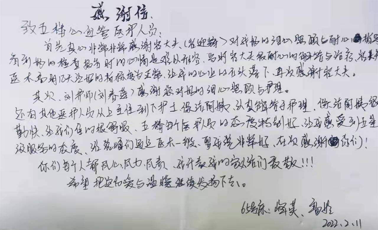 患者致:心内二科崔迎辉、刘春莲及全体医护人员