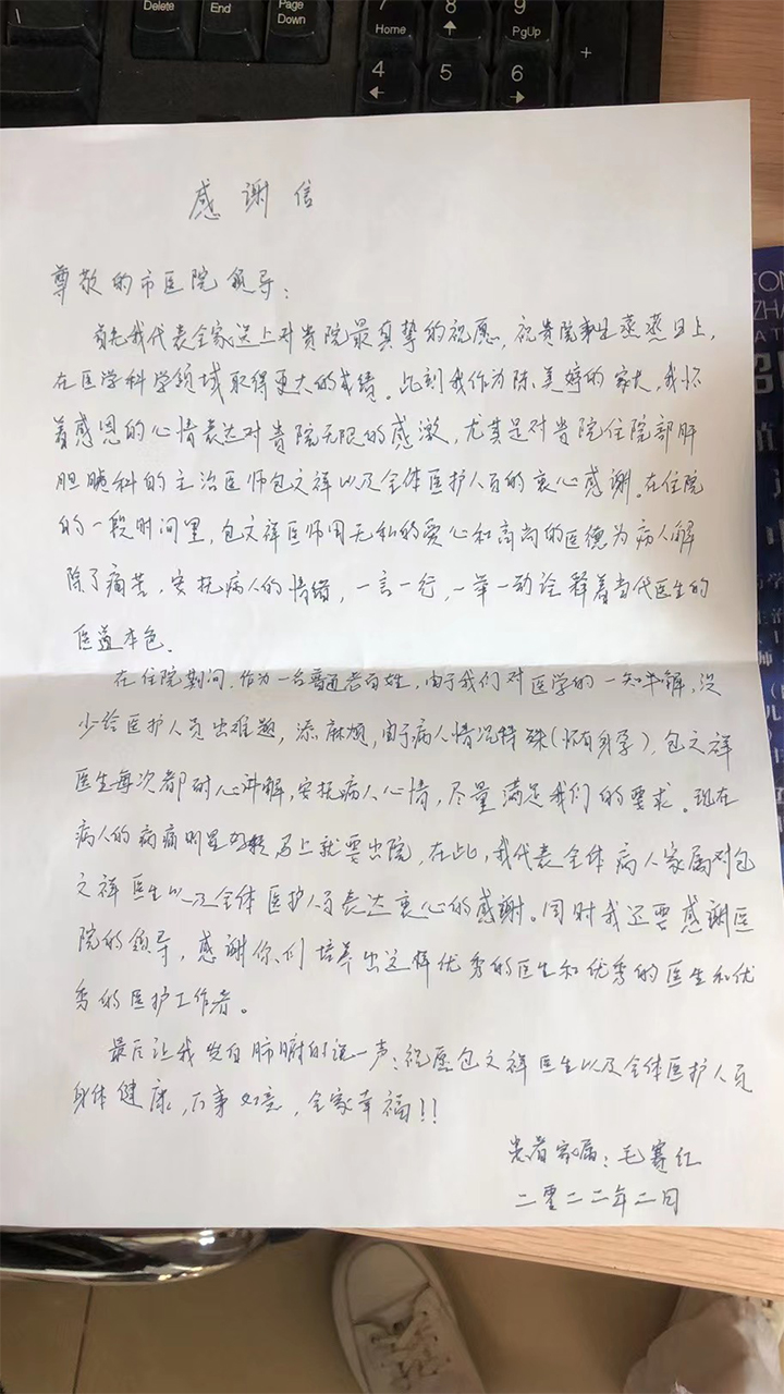 患者致:肝胆胰外科包文祥及全体医护人员