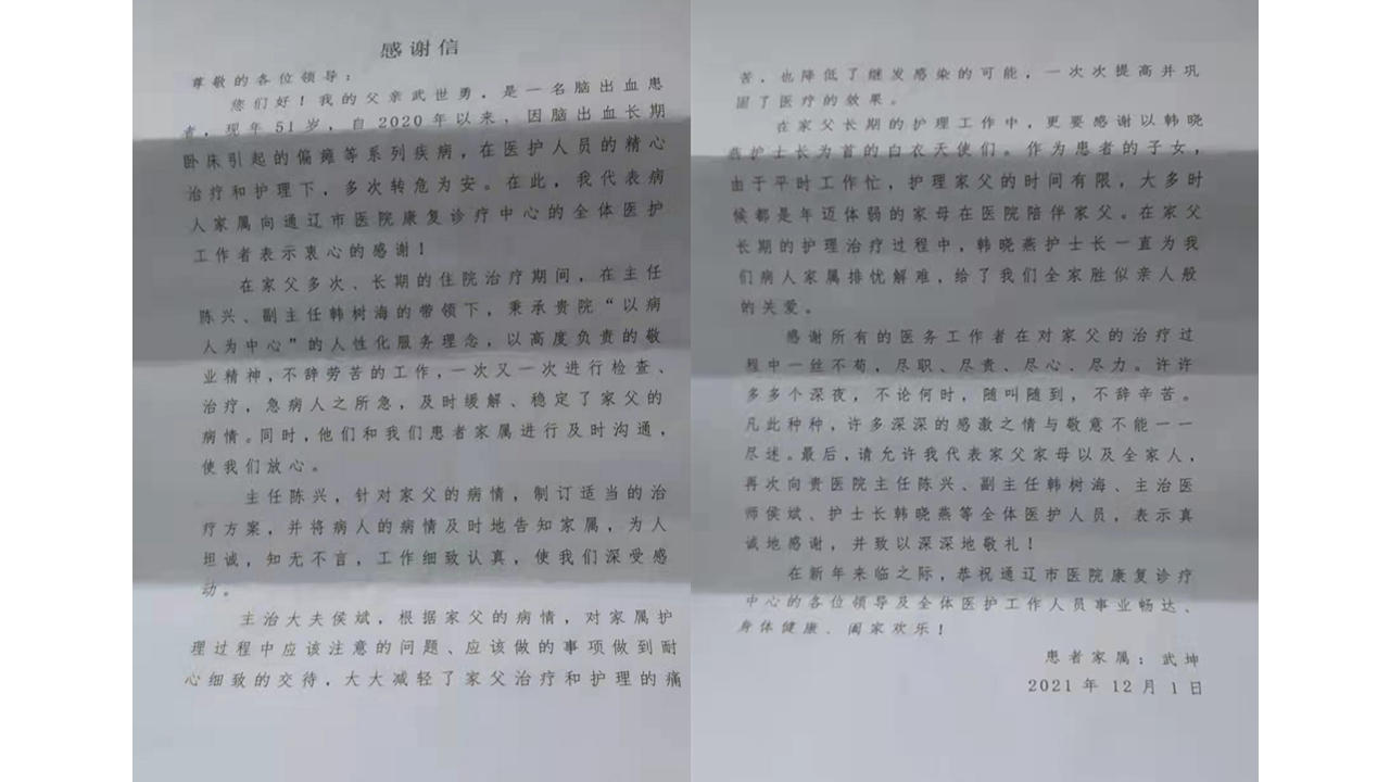 患者致:通辽市医院康复科陈兴主任,韩树海、候斌医生,韩晓燕护士长,及全体医护人员