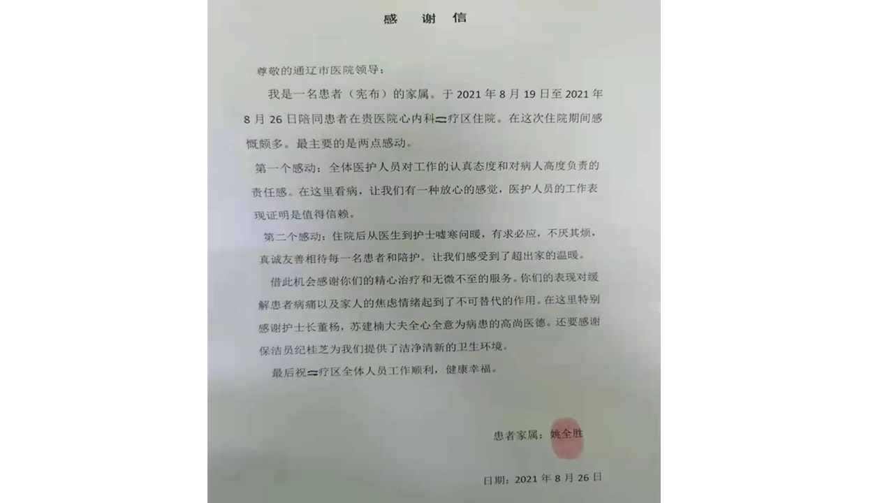 患者致:通辽市医院心血管内二科全体医护人员