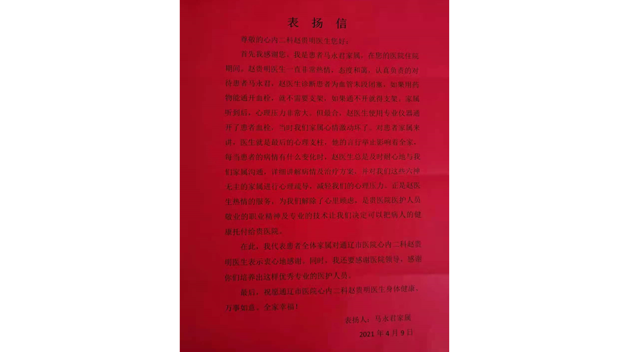 患者马永君家属致:通辽市医院心血管内二科赵贵明医生