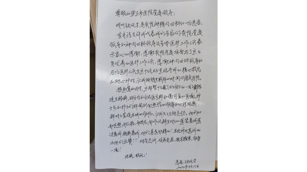患者张凤才致:通辽市医院神经内四科全体医护人员