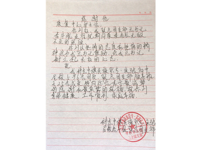 科左中旗民族职专实验学校各年组联合团支部致:通辽市医院康复中心李宇航护士及全体医护人员
