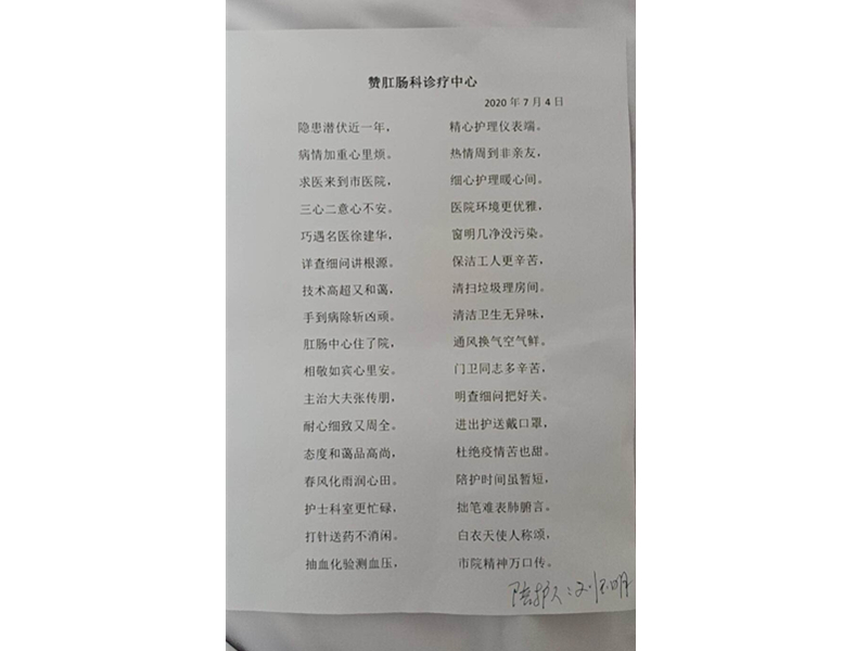 患者家属刘玉明致:通辽市医院肛肠诊疗中心