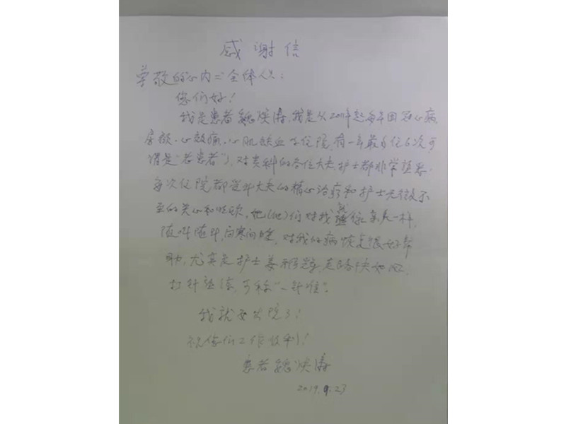 患者致:通辽市医院心血管内二科姜雅辉护士及全体医护人员