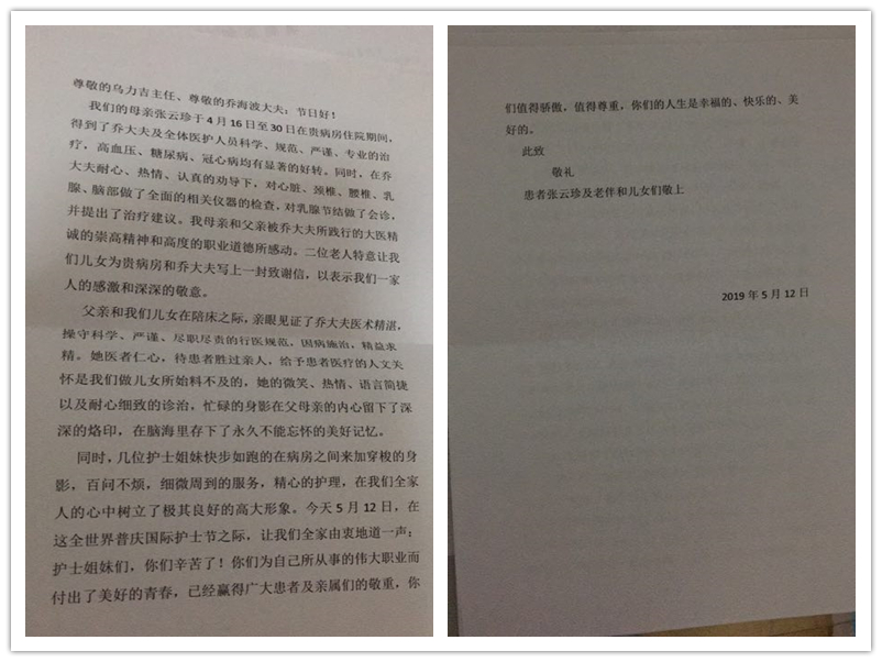 患者张云珍及家属致:通辽市医院干部病房主任乌力吉、医生乔海波