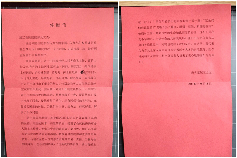 患者乌力吉家属致:通辽市医院神经内二科齐晓飞主任、郑哲龙医生、曹雅娟护士长及杨东影、贾丹丹护士以及科室全体医护人员