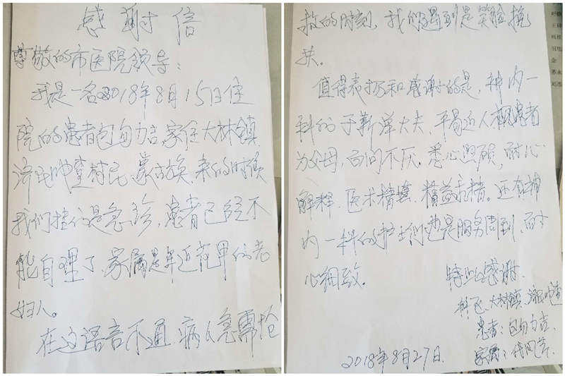 患者包乌力吉及家属致:通辽市医院神经内一科于靳洋医生及科室全体护士