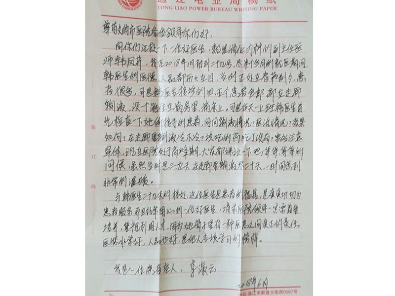 患者李淑云致:通辽市医院消化内科副主任医师韩凤芹