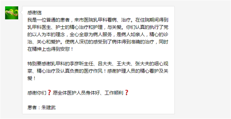 患者朱建武致:通辽市医院乳甲科主任李彦昕及全体医护人员