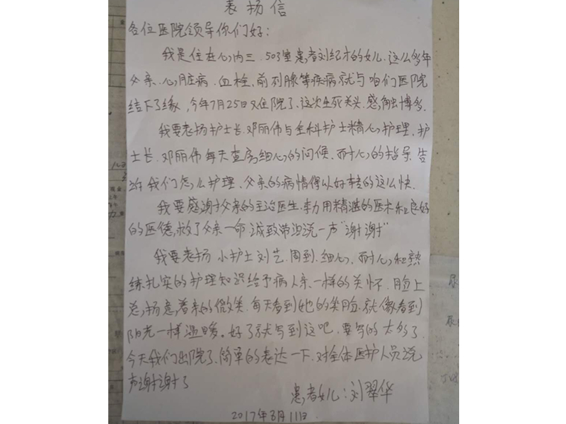 患者家属刘翠华致:通辽市医院心血管内三科医生李力、护士长邓丽伟、护士刘艺及全体医护人员