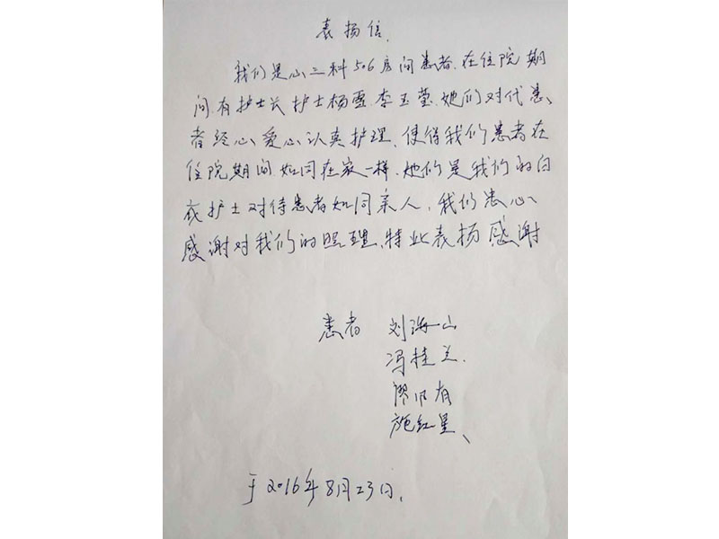 患者致:通辽市医院心血管内三科护士长、护士杨雪、李玉莹
